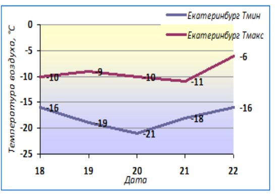 В холодном воздухе, уже заполонившем Урал, образуется антициклон, который усилит ночное выхолаживание воздуха (из-за малооблачной и слабо ветреной погоды). Амплитуда суточного хода температуры будет значительной (до 10-14°). Морозная погода при понижении средней суточной температуры воздуха от климатической нормы на 3-4° удержится до 21-22 февраля. В последующие дни воздух постепенно прогреется.