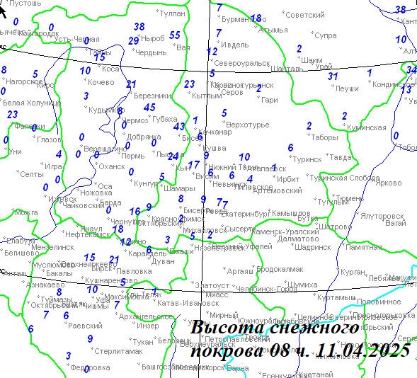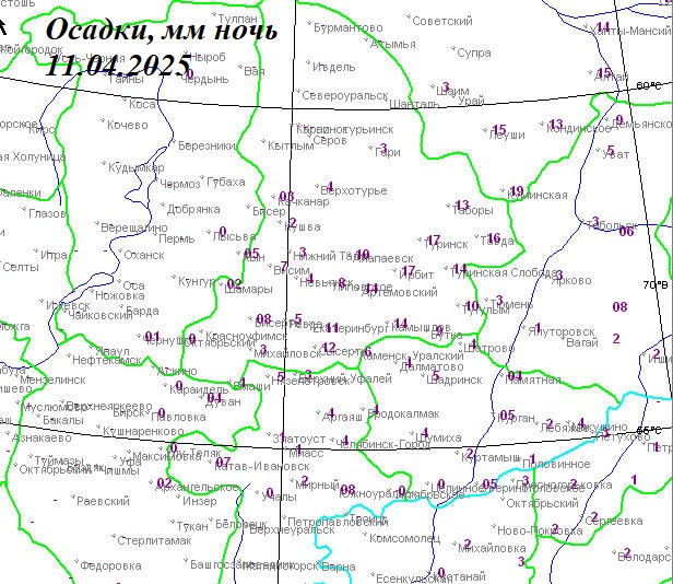 Непрерывный дождь в Екатеринбурге начался 10 апреля около 15 часов, к 20 часам выпало 11 мм осадков, температура максимальная 8,1°. В течение следующих полусуток (до 08 ч. 11 апреля) осадки выпадали в виде мокрого снега и снега, количество 8,5 мм (в сумме 19,5 мм- 63% месячной нормы). Минимальная температура -2,7°. Высота снежного покрова утром 7 см.