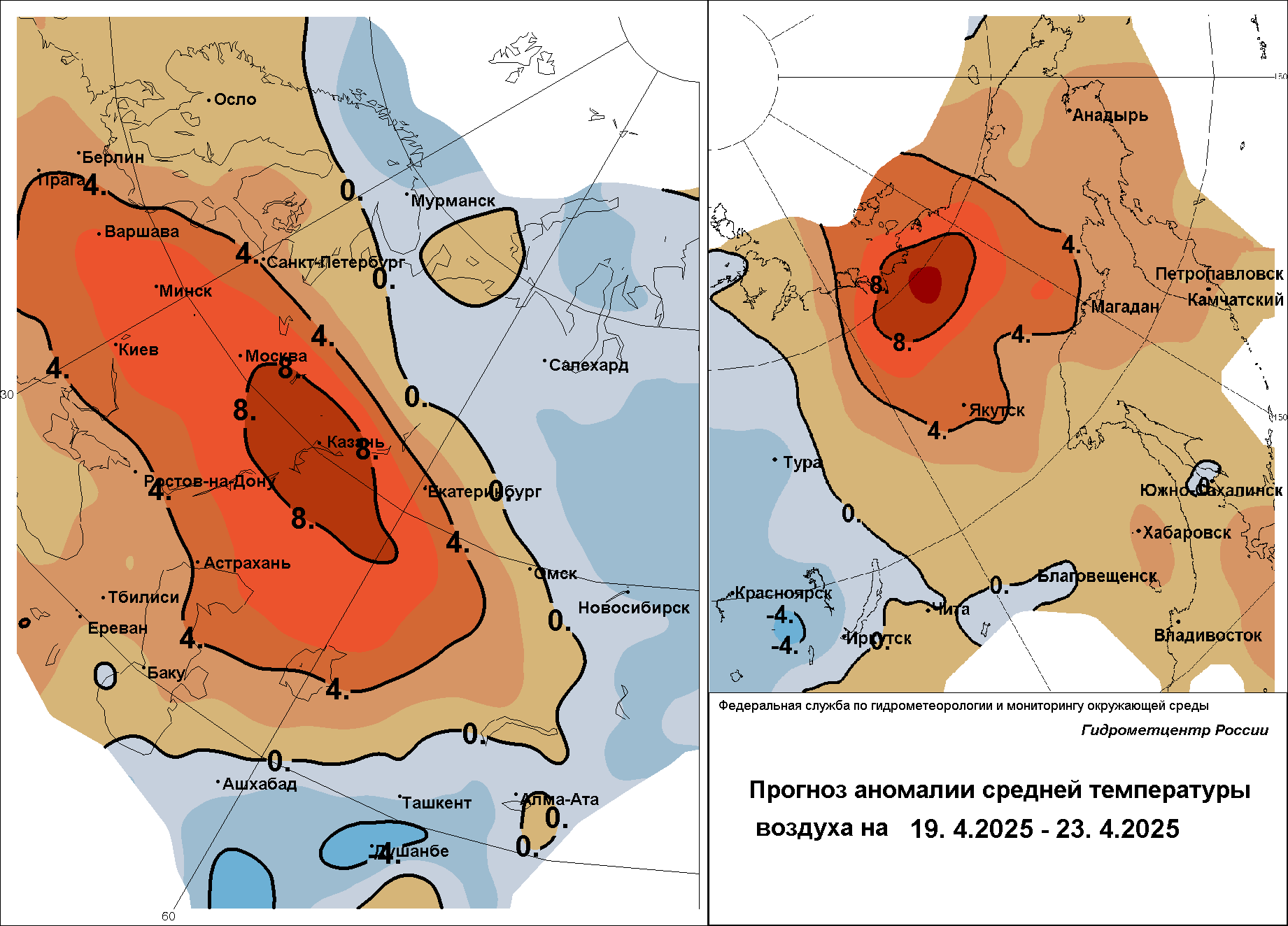 20 апреля погода теплая, но с севера начнет опускаться холодный фронт, который вызовет дожди, на юге области во второй половине дня возможны грозы. Температура днем на севере области на 4-5° ниже, чем в субботу.