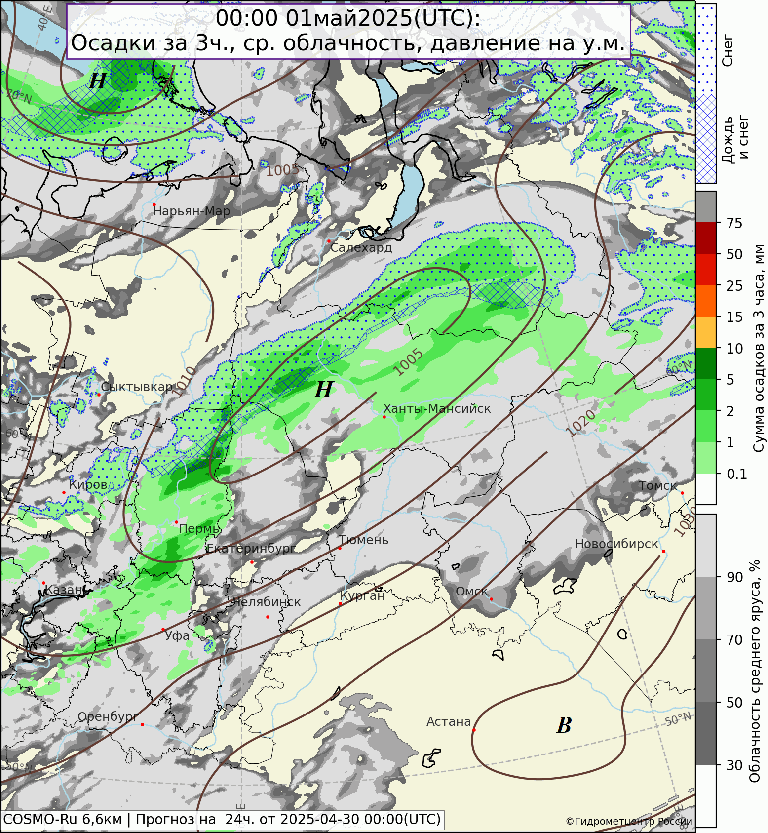 В течение выходного периода 1-4 мая Уральский регион посетят два циклона. Первый из них пройдет 1 мая вдоль северных границ Свердловской области, вызовет дожди, на севере области с мокрым снегом. Второй проследует в ночь на 3 мая.