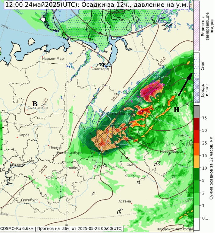 Сильные дожди (до 19 мм) прошли в Курганской области, там отметился поднявшийся с Казахстана циклон. В его тыл вошел холодный атмосферный фронт, что привело к активизации циклона, за минувшие сутки его воронка углубилась на 10 гПа. Облачная спираль циклона при его движении по Тюменской области на север коснется Свердловской области (рис), 24 мая ожидаются кратковременные дожди, на востоке области, перемежающиеся с мокрым снегом. После ухода циклона в ночь на 25 мая вероятны заморозки.