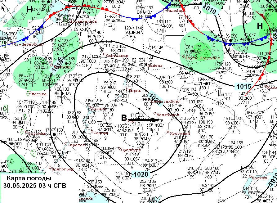 Антициклон изначально, с момента своего прихода на Урал, был настроен на свое разрушение: атмосферное давление в его центре неуклонно понижается (27 мая было 1032 гПа, к 30 мая понизилось до 1024 гПа). Завтра антициклон переместится на восточные склоны Южного Урала, падение давления продолжится. С ослаблением антициклона более влажный воздух с Европейской территории России поступит на Урал, что приведет 1 июня к внутримассовой конвекции, образованию облаков и кратковременных дождей, вначале локальных, но 2-3 июня при движении атмосферного фронта дождь, гроза возможны уже во многих районах.