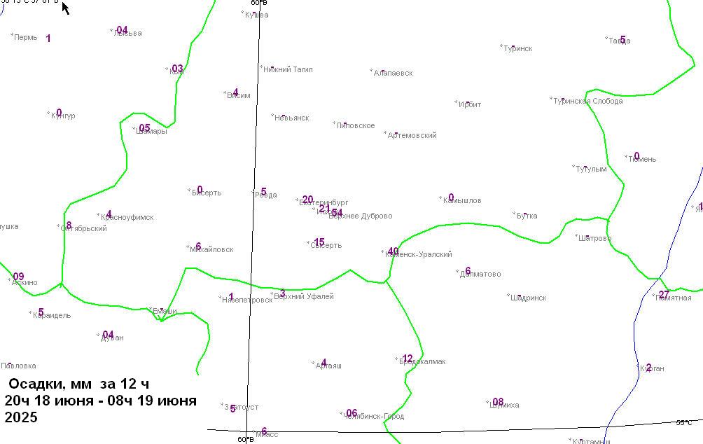 Дожди и грозы, наблюдавшиеся минувшим вечером и ночью 20 июня, вызвал циклон, проходивший через север Челябинской области. Очаг наиболее интенсивных дождей, находившийся на северной периферии циклона, пришелся на крайний юг Свердловской области, включая Екатеринбург, где выпало 24 мм (4 мм с вечера, 20 мм за ночь, около 33 % месячной нормы). Сильные дожди прошли также в Сысерти 15, Истоке 21, Каменске-Уральском, больше всего осадков в Верхнем Дуброво – 54 мм (75% месячной нормы). В центре и на севере Свердловской области осадков не было.