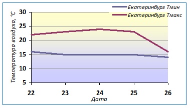 20 июля по сравнению с субботой 19 июля средняя суточная температура на юге Свердловской области повысилась на 4°: в Екатеринбурге составила 19,4°, что близко к норме. На севере области не дотягивала до нормы 2-4°. Холодной была ночь 21 июля на крайнем севере: Атымья +0,4°, Бурмантово +1,2, Ивдель +3,5°. В Екатеринбурге было теплее всего 13,7°.