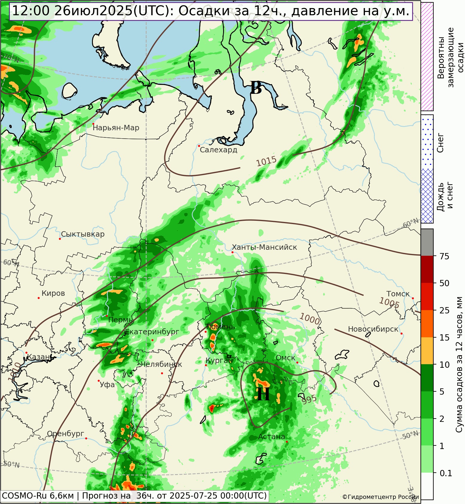 Сильные дожди в минувшие сутки наблюдались в Курганской области 17-27 мм/12ч. В Свердловской области ночью 25 июля количество осадков 0,1-9 мм, в западной половине области отмечались грозы, которые днем 25 июля распространяются и в центральные районы.