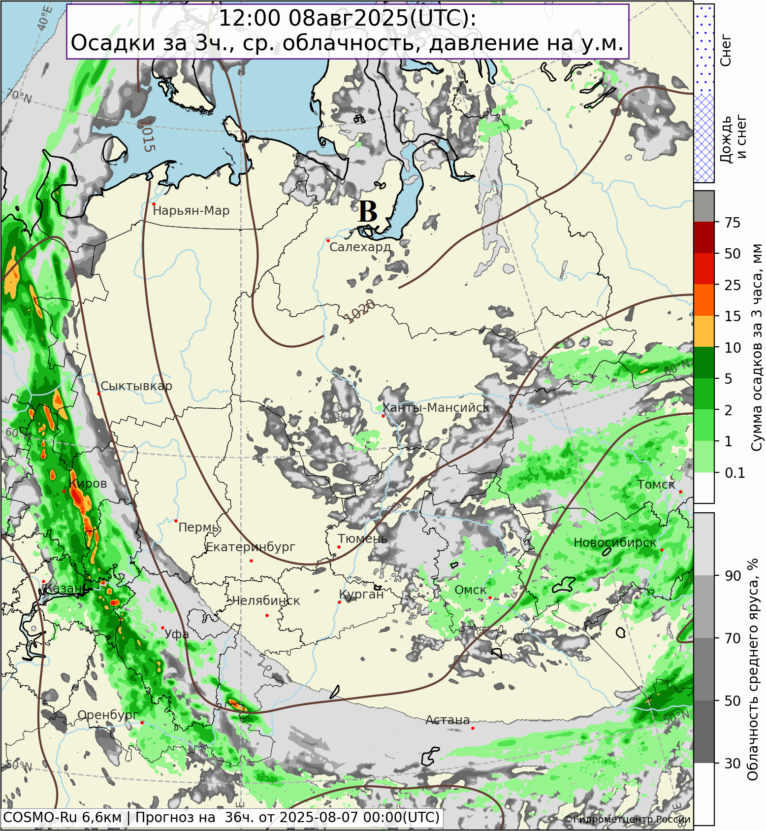 Очень сильный дождь прошел в Североуральске, ночью 7 августа выпало 82 мм осадков, что соответствует месячной норме. Конвективным осадкам способствовал недалекий атмосферный фронт над Пермским краем и выраженный рельеф гор Северного Урала. В соседнем Карпинске выпало 26 мм, Серове 9 мм, Краснотурьинске 6 мм.