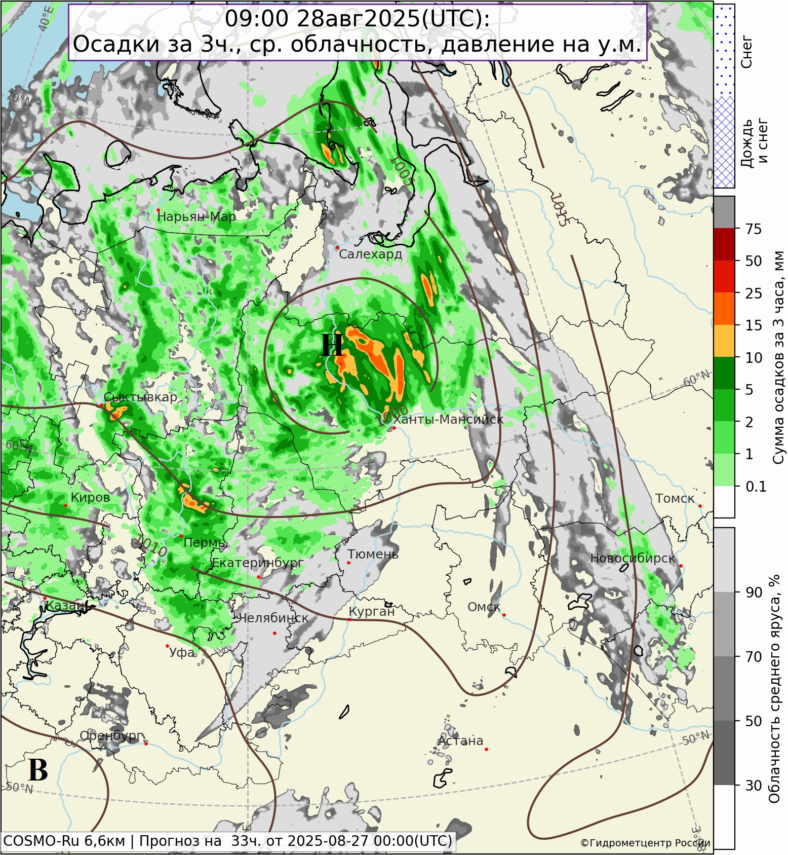Ночью 27 августа сказалось влияние оформившегося барического гребня: было сухо, температура 8-13°, на крайнем севере 3-7°. В Екатеринбурге вчера днем 25,2°, минувшей ночью 11,2°, без осадков.