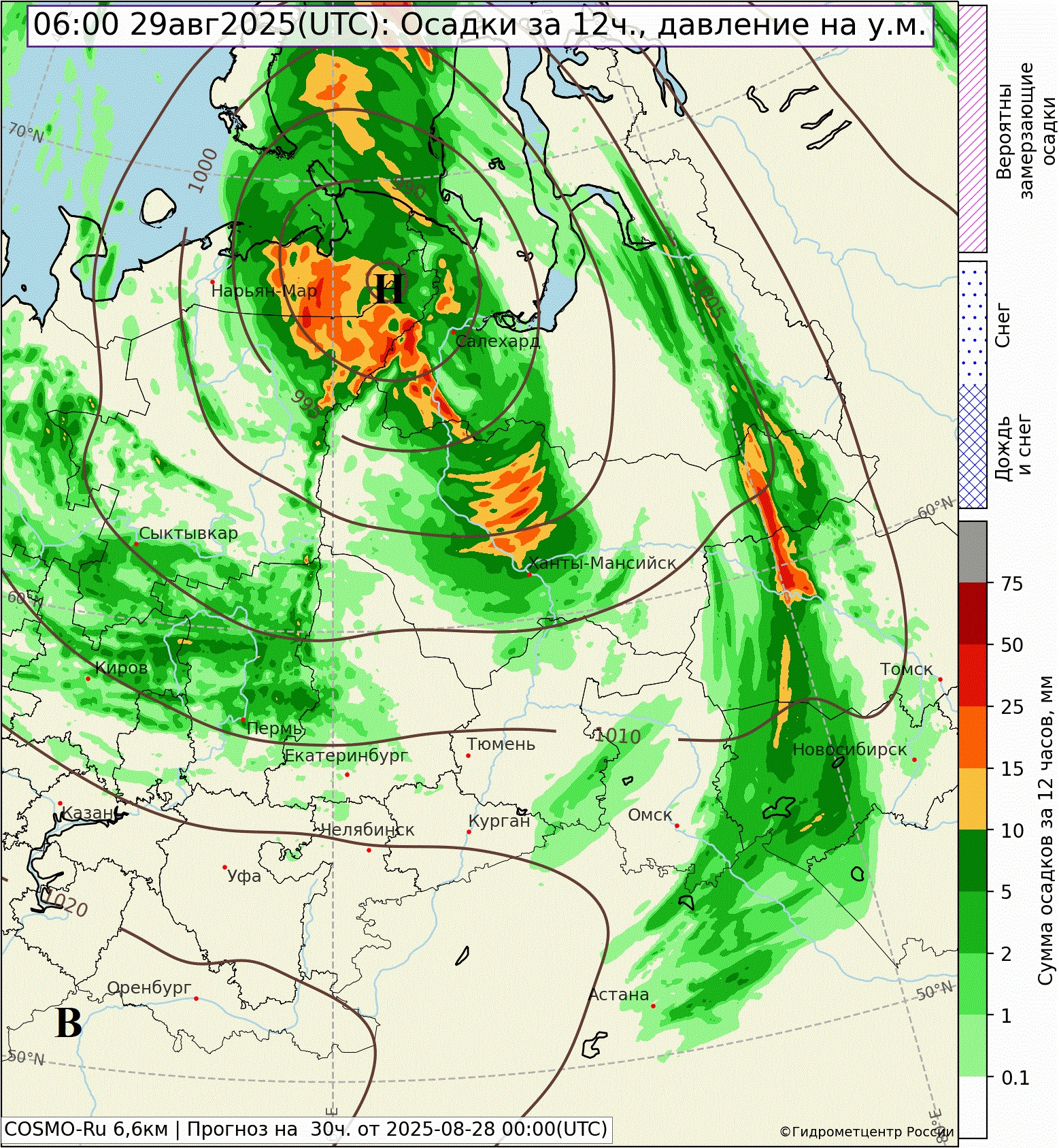 Прогноз осадков на 11 часов мест.времени 29 августа 2025 года