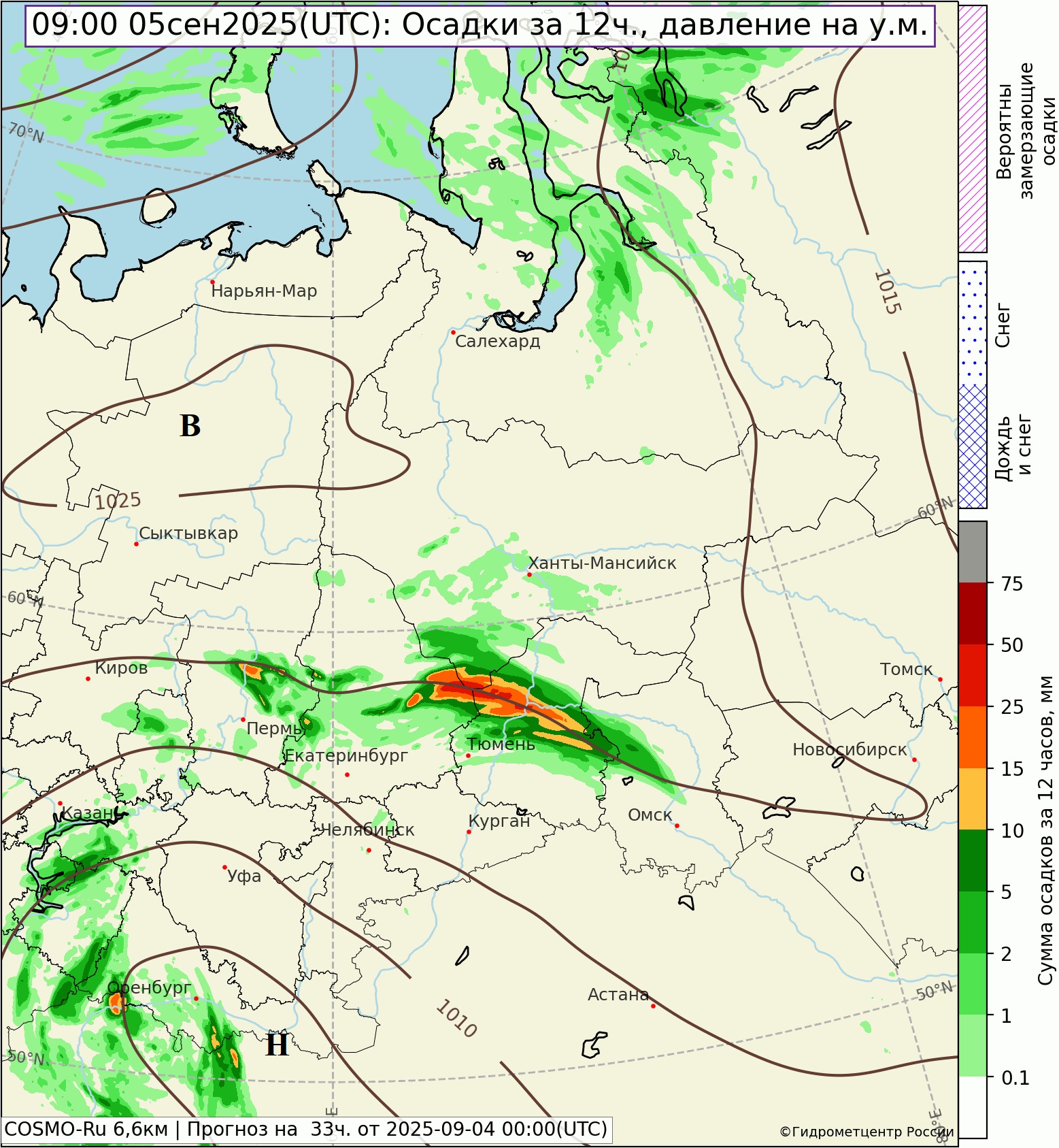 В Прикаспийском регионе 5 сентября образуется новый циклон, с которым сольется уральский циклон. Вся циклоническая система медленно будет перемещаться на восток. Значительные дожди ожидаются 6 сентября в Челябинской области. В Свердловской области осадки ослабеют и днем 6 сентября почти прекратятся.