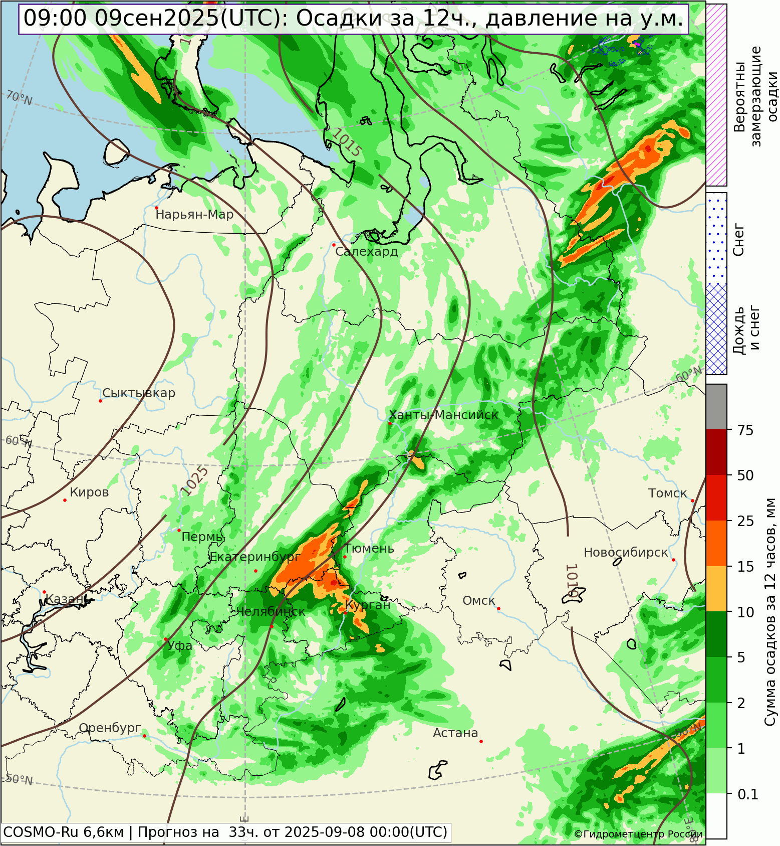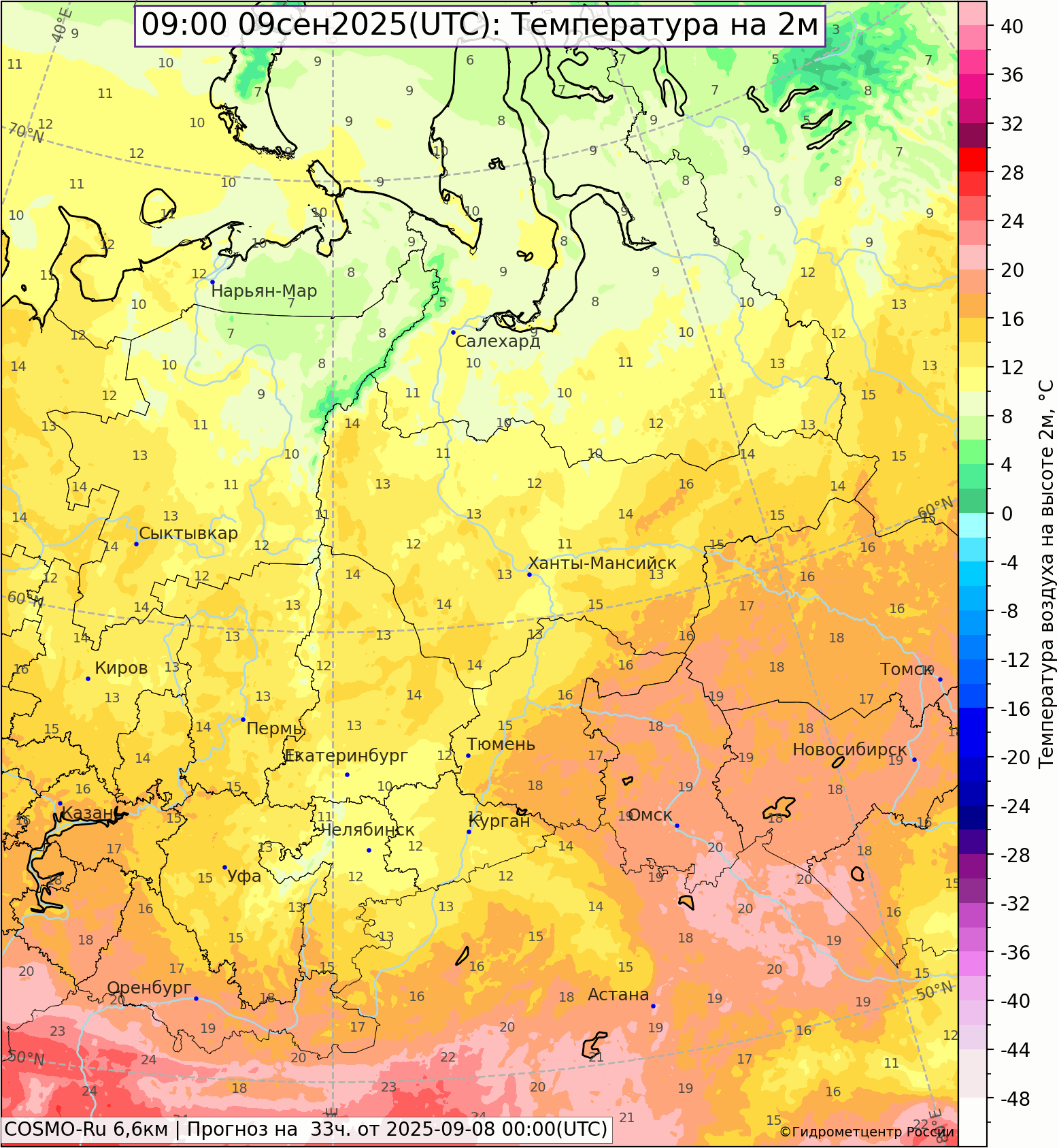 Прогноз осадков и температуры на 14 ч мест. врем. 9 сентября 2025 г.