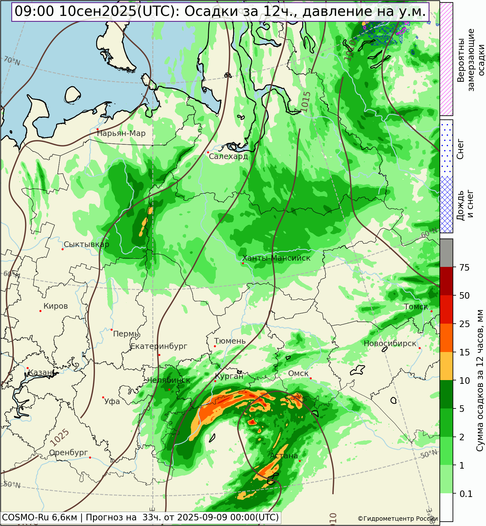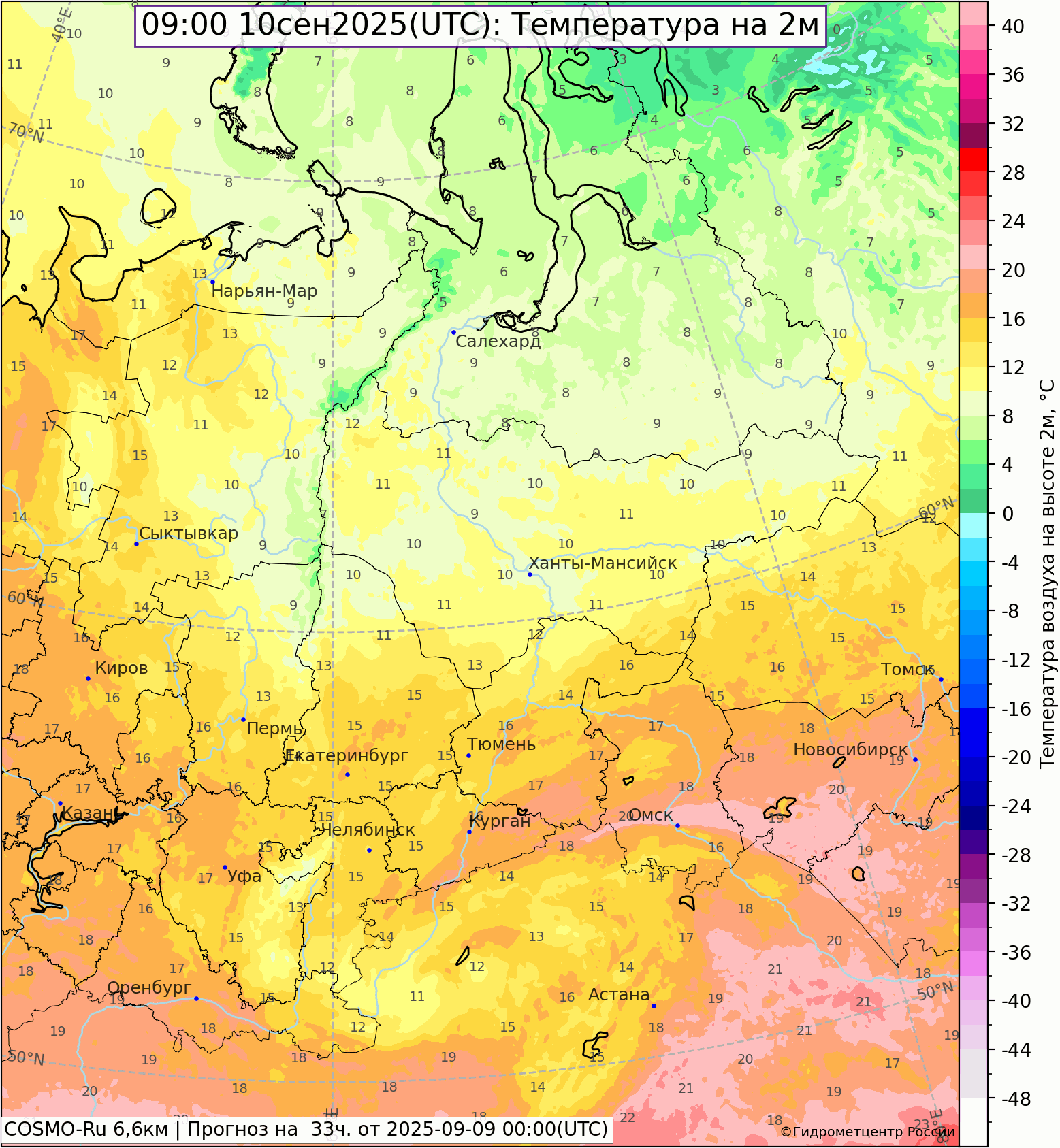 Прогноз осадков и температуры на 14 час мест.вр. 10 сентября 2025 г.