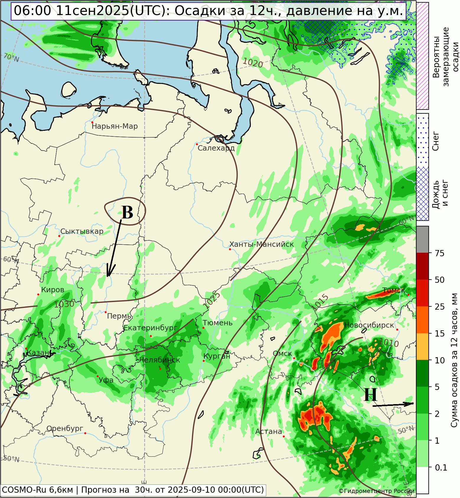 Умеренные дожди 6-11 мм прошли днем 9 сентября на востоке Свердловской области в зоне циклона, уходящего на север Казахстана. В Челябинской, Курганской области при этом дожди были сильными (15-25 мм). В поступающем с севера холодном воздухе температура ночью на севере Свердловской области понижалась до 1-5°.