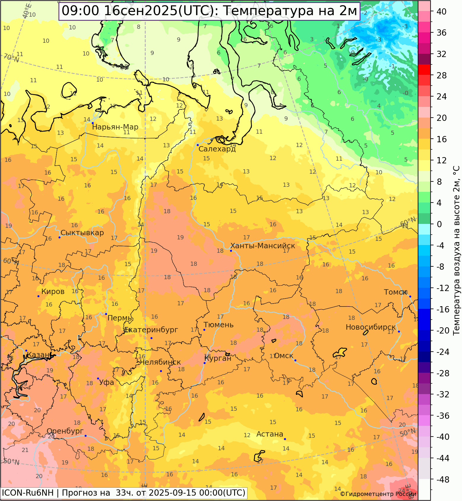 Прогноз температуры воздуха на 14 час мест.вр. 16 сентября 2025 г.
