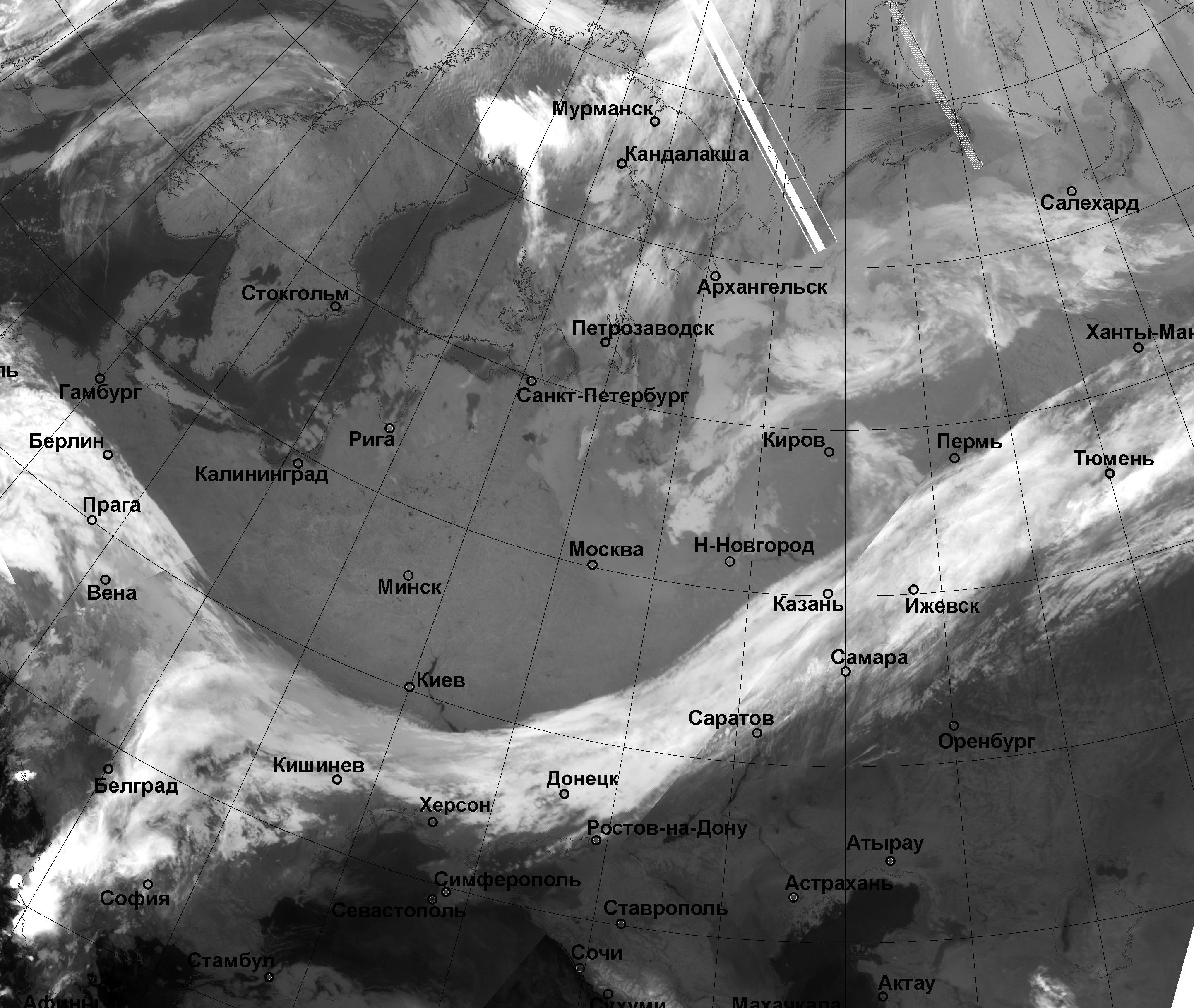 Облачность атмосферного фронта вытянулась от Урала далеко на запад. КА Метеор-М 25.09.2025