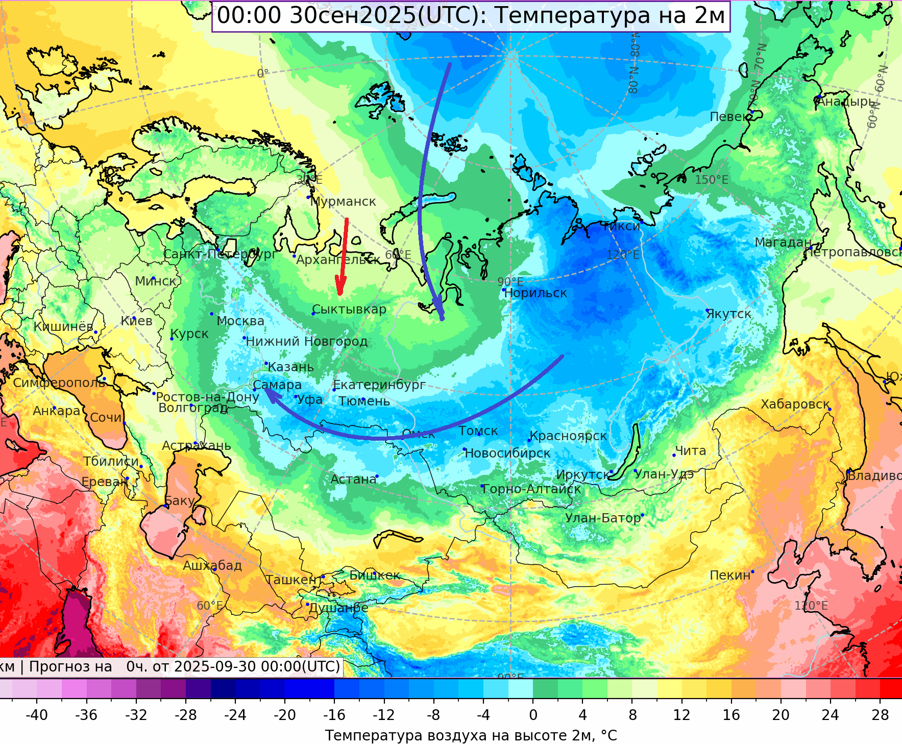 Холодный воздух Таймыра и моря Лаптевых, огибая восточную периферию антициклона, занявшего центр ЕТ России, проник через Урал до самых западных границ страны (рис.). В ближайшие дни воздух будет поступать с менее сурового региона, с Баренцева моря, кое-где вероятен небольшой кратковременный дождь, ночью со снегом, будет ветрено, немного потеплеет. К 4 октября антициклон, преодолев струю северо-западных ветров, вплотную приблизится к Уральскому хребту и на несколько дней (ориентировочно до 8-9 октября) обеспечит преимущественно малооблачную погоду при умеренной температуре – средняя за сутки ожидается 6-8°, что на 2-3° выше нормы.