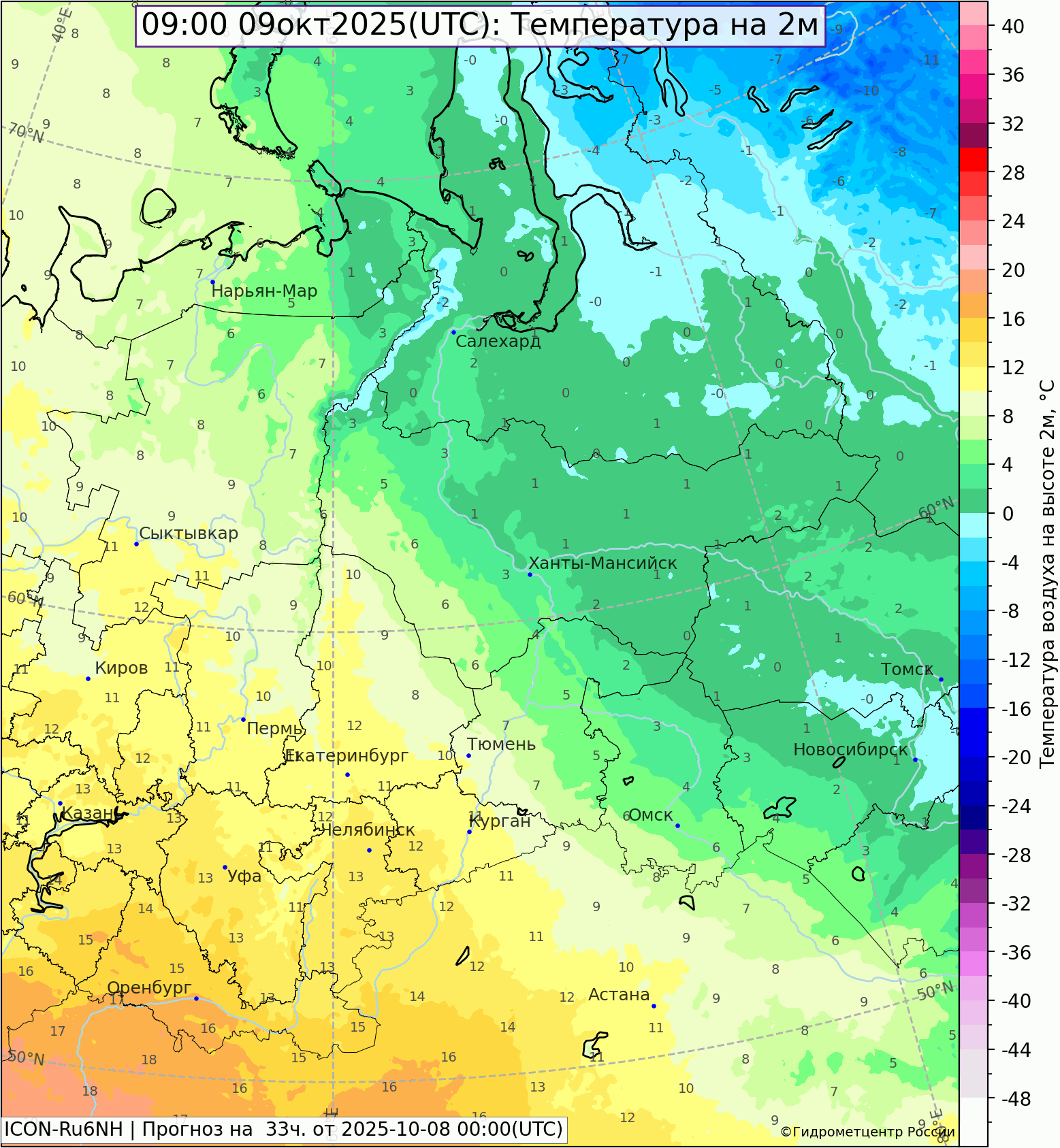 Днем было от +11,5° в Атымье до +16,0° в Михайловске, в Екатеринбурге 14,9°. Минувшей ночью преобладала минусовая температура -1,-6°, остров тепла – Екатеринбург +1,2°, в Истоке (окраина) -2,3°.