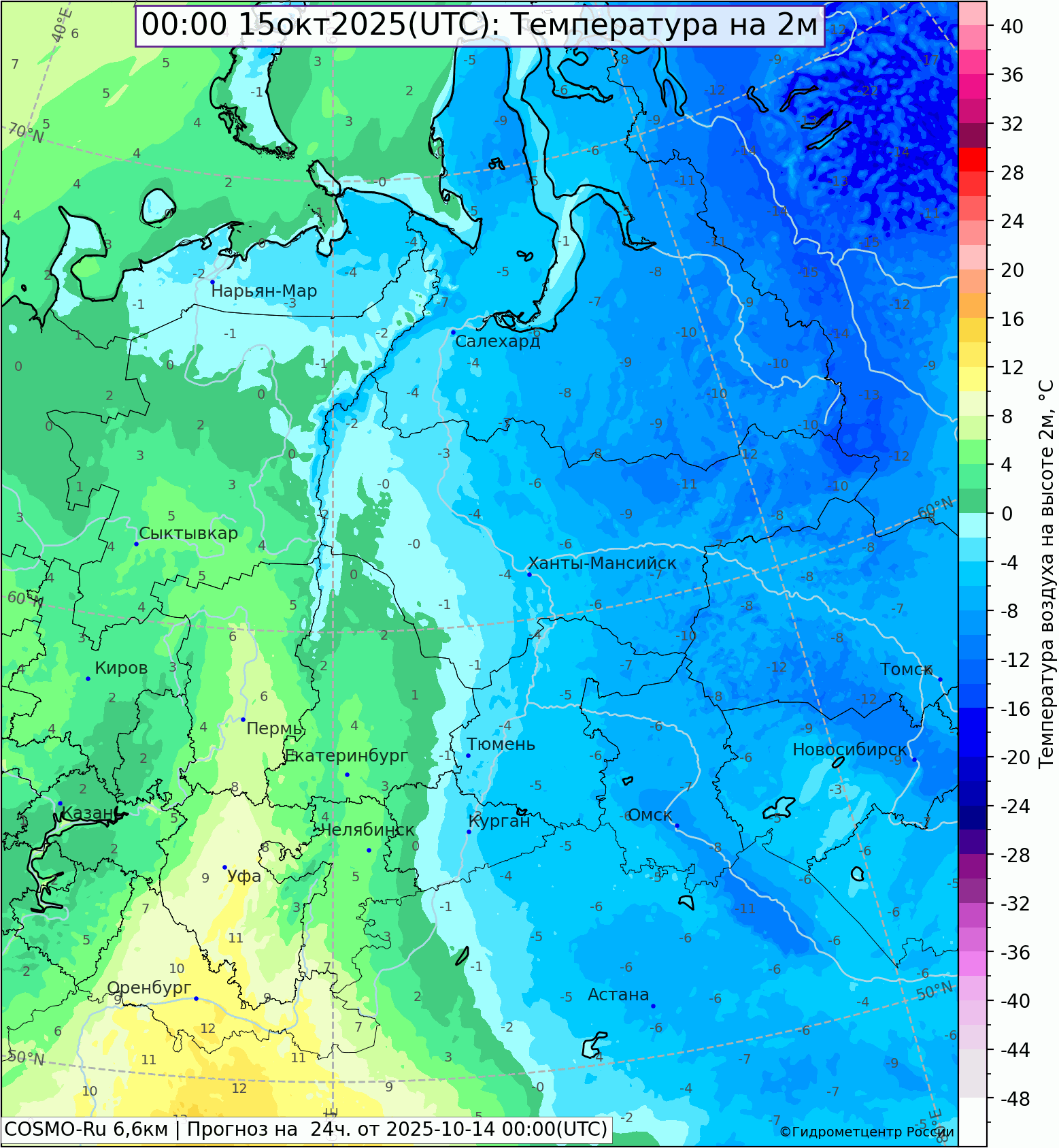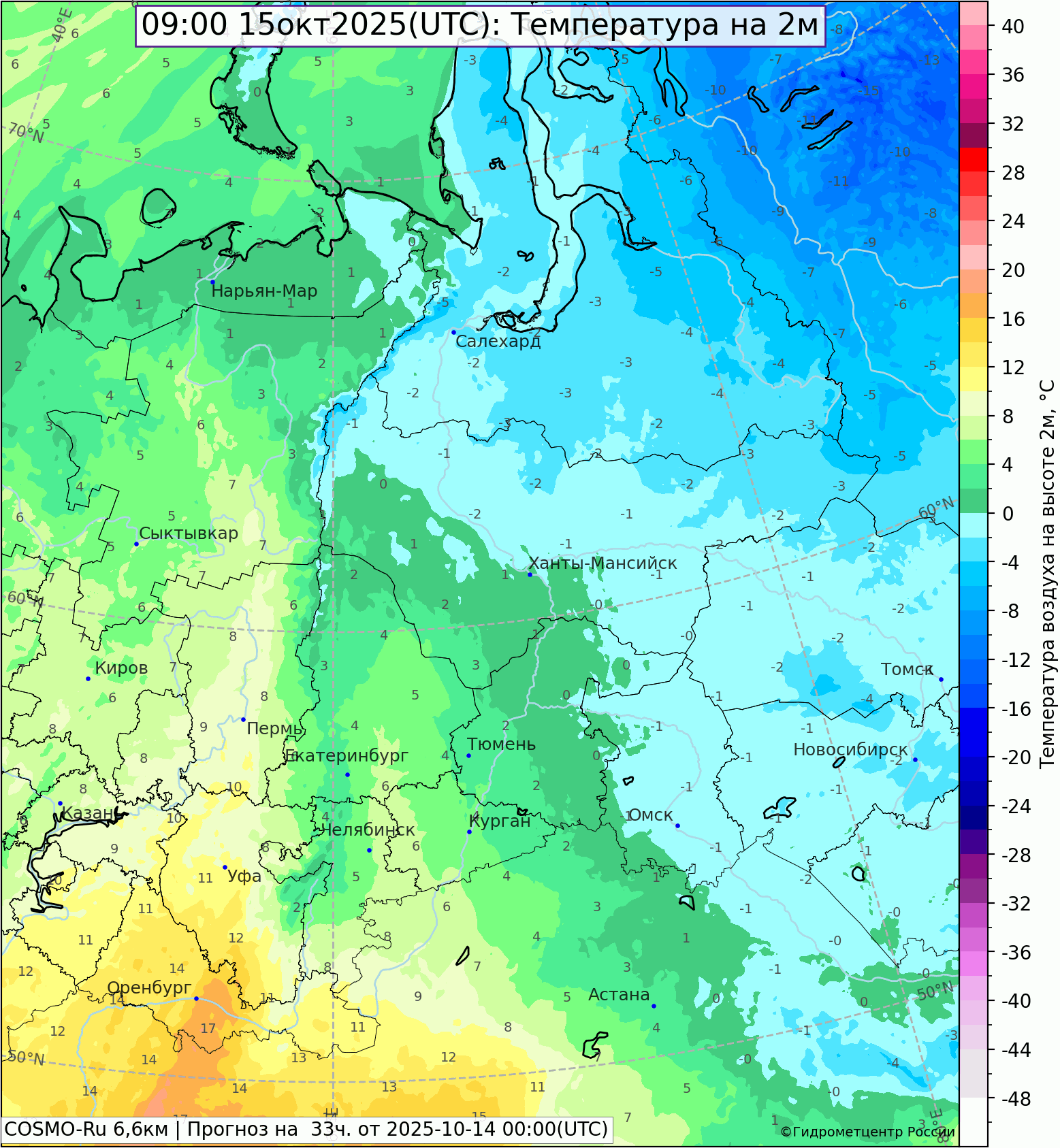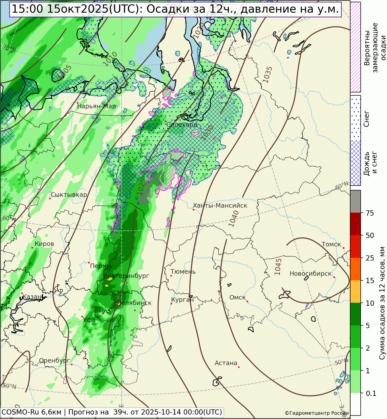 Фронтальная система с ЕТ России подошла к Уралу, продвигается медленно, упираясь в антициклон над Западной Сибирью. 15 октября подвижки окклюдированного фронта будут заметнее, он войдет в пределы Свердловской области. Осадки в виде дождя и мокрого снега выпадут в большинстве районов, но на востоке области их будет немного, на западе ожидаются умеренные осадки (5-12 мм). Ночью отрицательная температура ожидается на севере и востоке области, днем на всей территории заметно выше 0°.