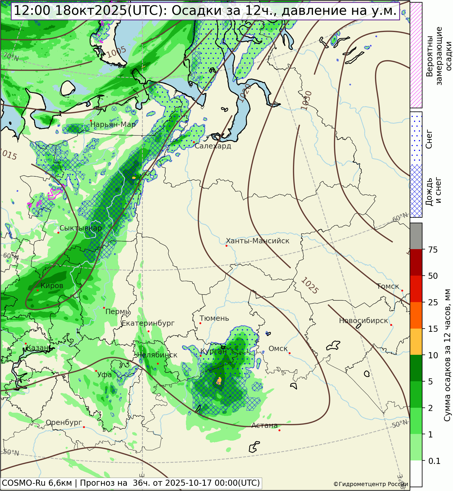 Температура воздуха днем в Свердловской области была от +2,8° в Таборах до +7,6° в Артемовском, ночью 17 октября от +0,1 в Кытлыме, до +3,6° в Красноуфимске. Днем лидером по осадкам оказался Екатеринбург- 4 мм, Верхнее Дуброво – 3 мм. Прошедшей ночью усилились осадки на севере области: Качканар 11 мм, Кытлым 6 мм (снежный покров удерживается 1 см), Краснотурьинск, Североуральск 5 мм, Серов 4 мм. Температура в Екатеринбурге днем +5,4, ночью +1,3° (0,9 мм осадков в виде дождя).