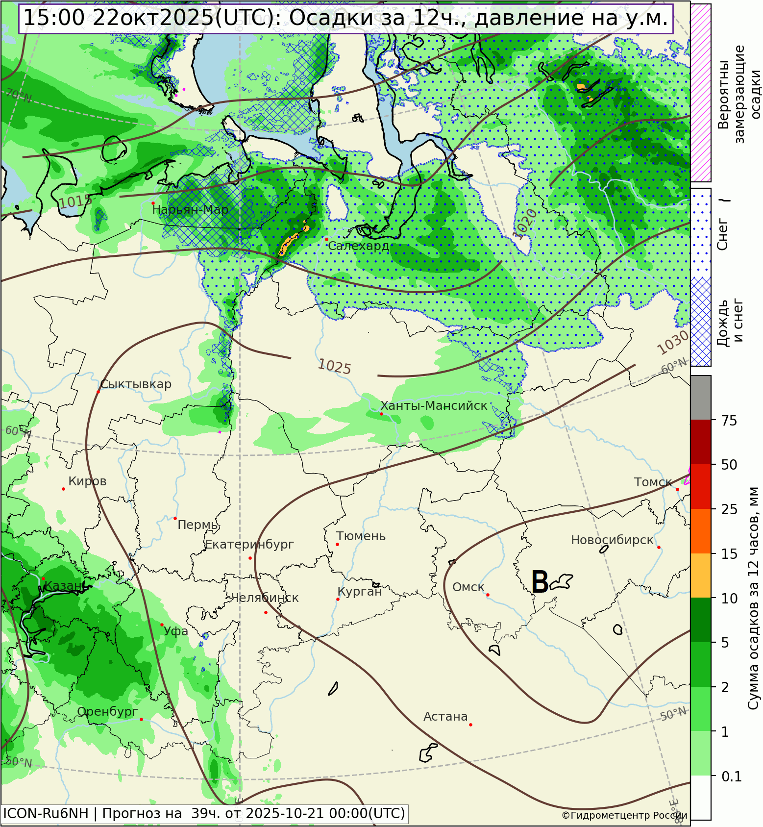 Вечером 21 и ночью 22 октября небольшая зона осадков (дождь с мокрым снегом), оторвавшись от частного циклона на ЕТ России, пройдет с запада на восток через северные районы Свердловской области. Днем 22 октября преимущественно без осадков и довольно тепло +7,+10° (рис.).