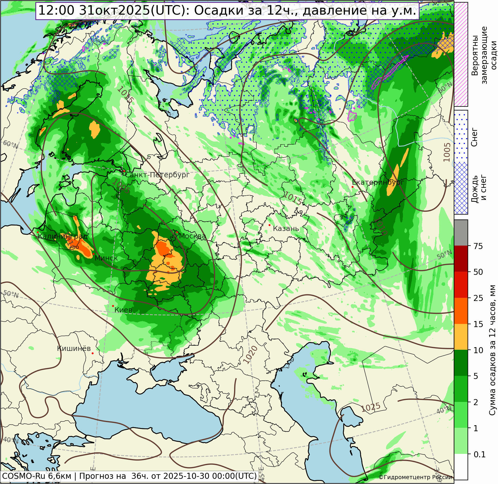 31 октября при отходе циклона на северо-восток, осадки ослабеют, но в северных районах могут перемежаться с мокрым снегом. Станет прохладнее на 3°.