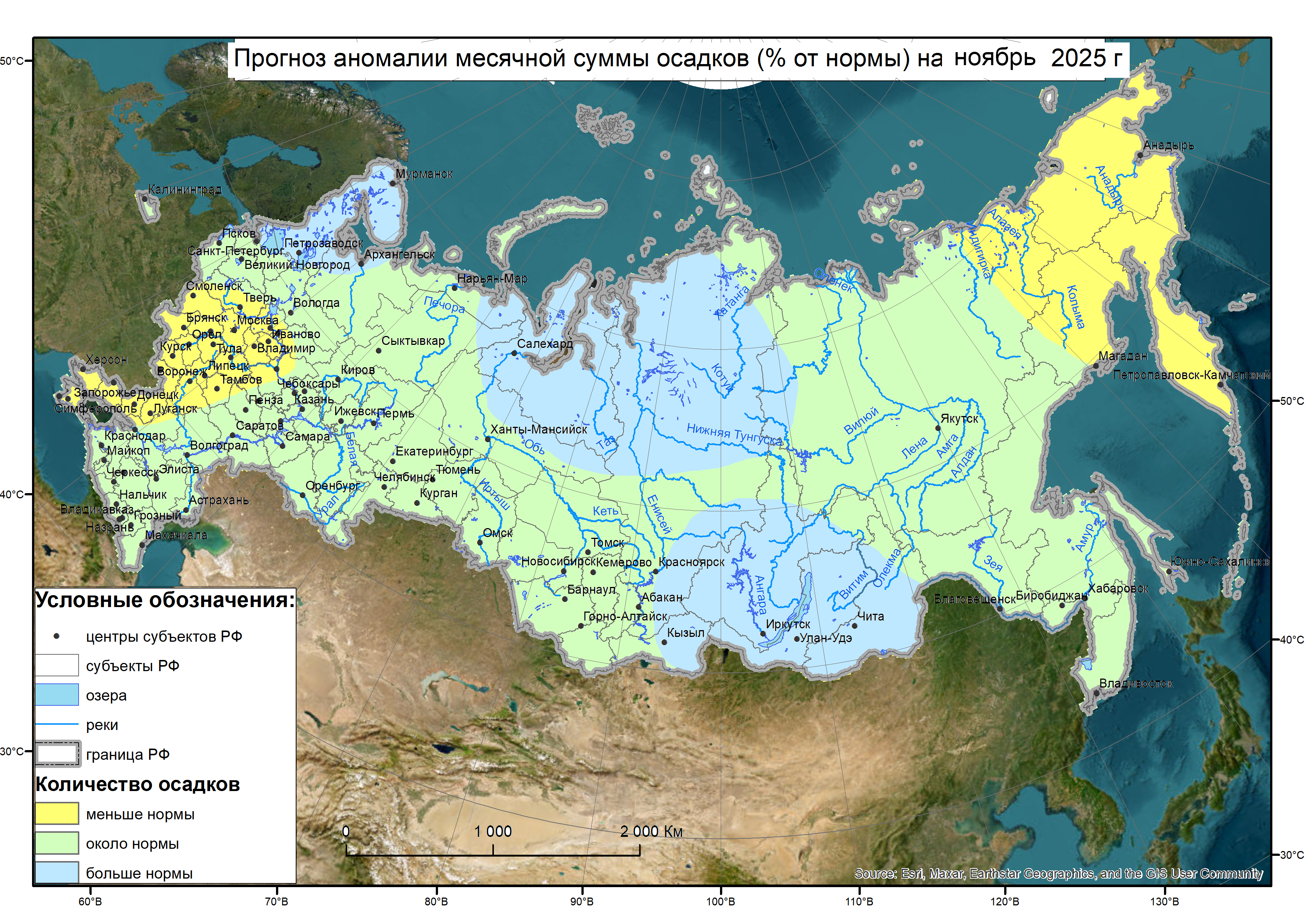 Месячное количество осадков составляет 30-43 мм, в горах юго-запада 62 мм. Число дней с осадками колеблется от 11 до 14, в горах до 18-20. В первой декаде еще возможен дождь, начиная со второй декады осадки выпадают в виде снега. Устойчивый снежный покров образуется обычно в первой и в начале второй декады ноября, высота его к концу месяца достигает 9-17 см, в горах 20-29 см. Однако в отдельные годы снежный покров может отсутствовать до конца ноября или, как было в 1979, 1982, 1985,1990, 2014, 2015 годах, устанавливаться уже в октябре.