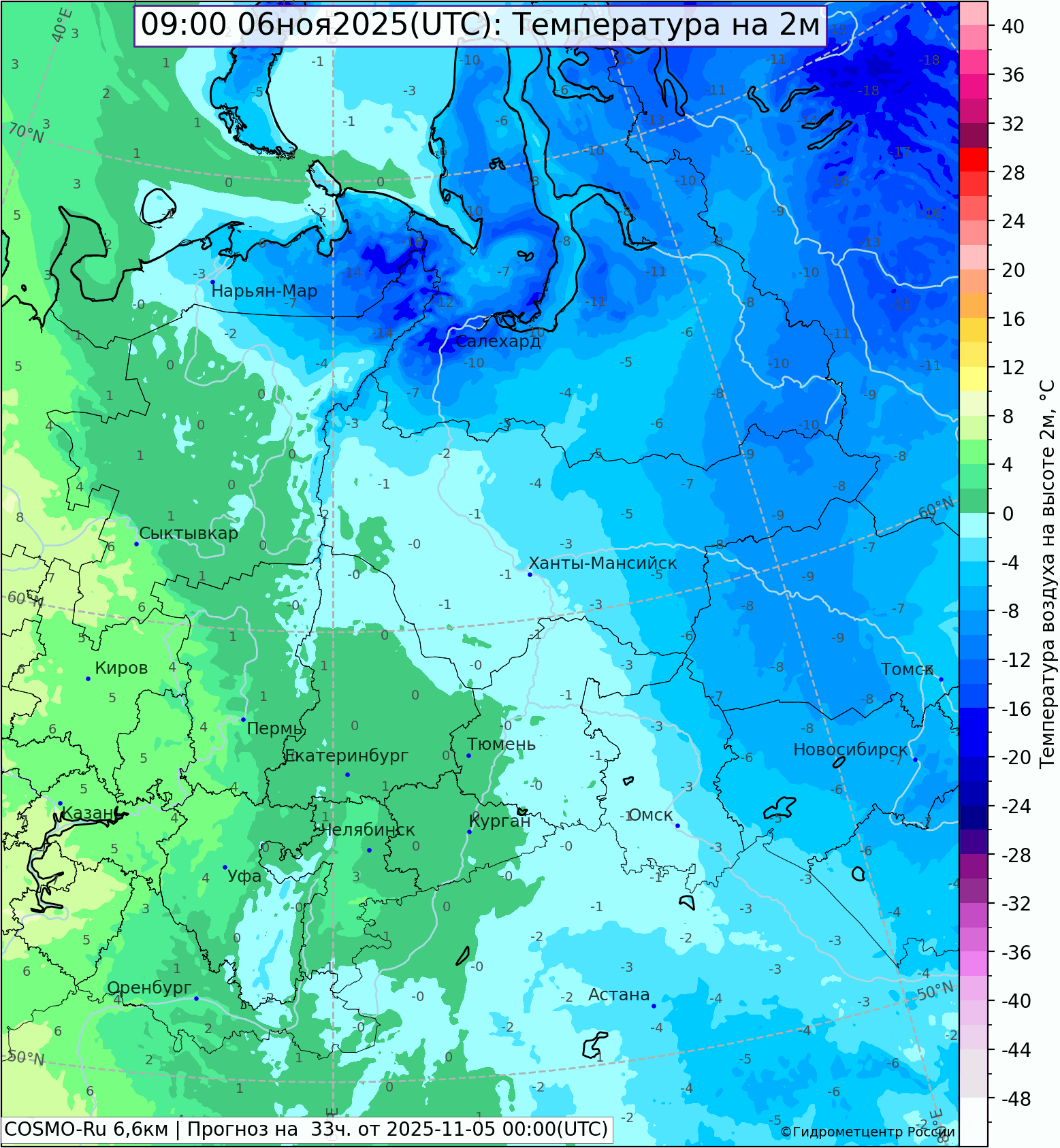 Вчера днем температура была 0,-5°, на востоке области -6,-8°, минувшей ночью от -4,0° в Североуральске до -14,2° на востоке области в Тугулыме. Сильный снег ночью наблюдался в Атымье 6 мм и Шамарах 8 мм, снежный покров в этих пунктах увеличился до 6-9 см, на остальной территории Свердловской области преимущественно 0,5-3 см. Интенсивные снегопады, гололед отмечены в Пермском крае, высота в центре и на севере края 6-14 см.
