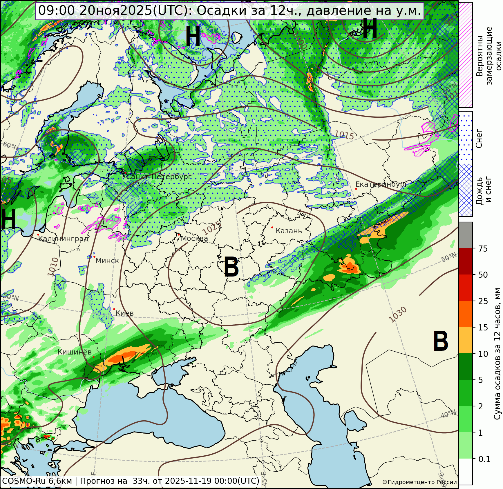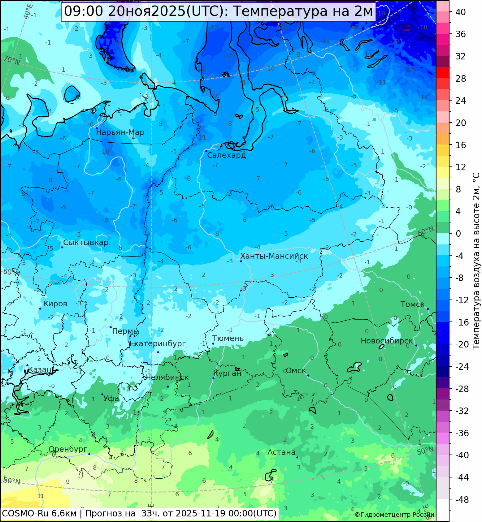 В течение дня 19 ноября тепло, +4,+7°, но к западным границам области уже приближается холодный атмосферный фронт, который вызовет небольшие дожди (на севере области кое-где с мокрым снегом). Поздним вечером фронт доберется до восточных окраин области. Поступит воздушная масса на 10° холоднее сегодняшнего воздуха, 20 ноября вновь немного подморозит. При этом к южному Предуралью быстро поднимется подвижный антициклон с районов Украины, 20-21 ноября под его влиянием будет без осадков при небольших «минусах» температуры. В выходные дни возрастет вероятность осадков.