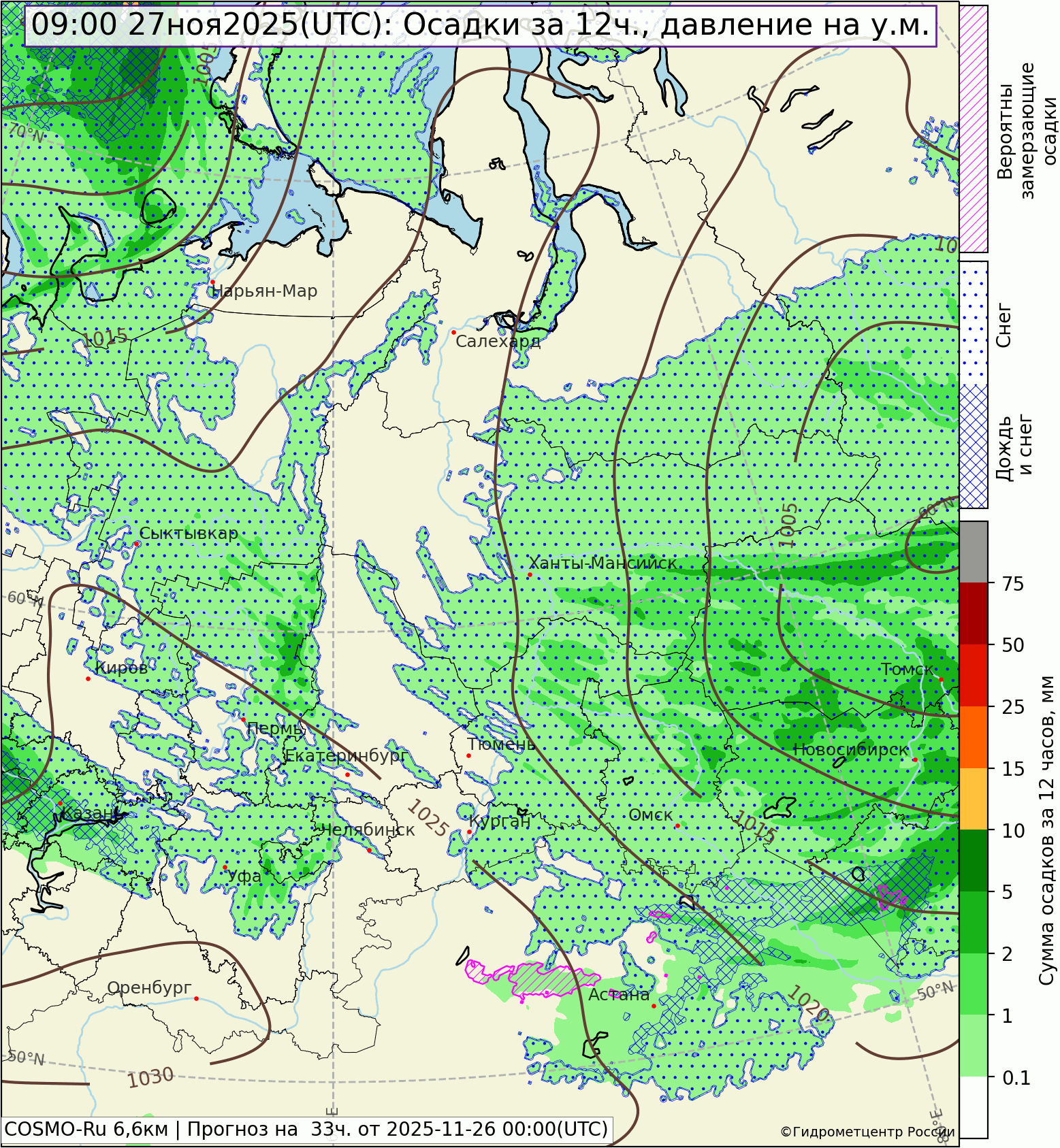 Днем температура воздуха была +1,+5°, минувшей ночью -3,+1°. Местами наблюдались небольшие осадки (дождь, снег 0,1-2 мм), на крайнем севере умеренные 5-8 мм (Качканар, Атымья). Екатеринбург: днем +3,6, ночью -0,5° (0,4 мм осадков). Под действием оттепели снежный покров разрушался, лишь в Атымье подрос до 22 см .