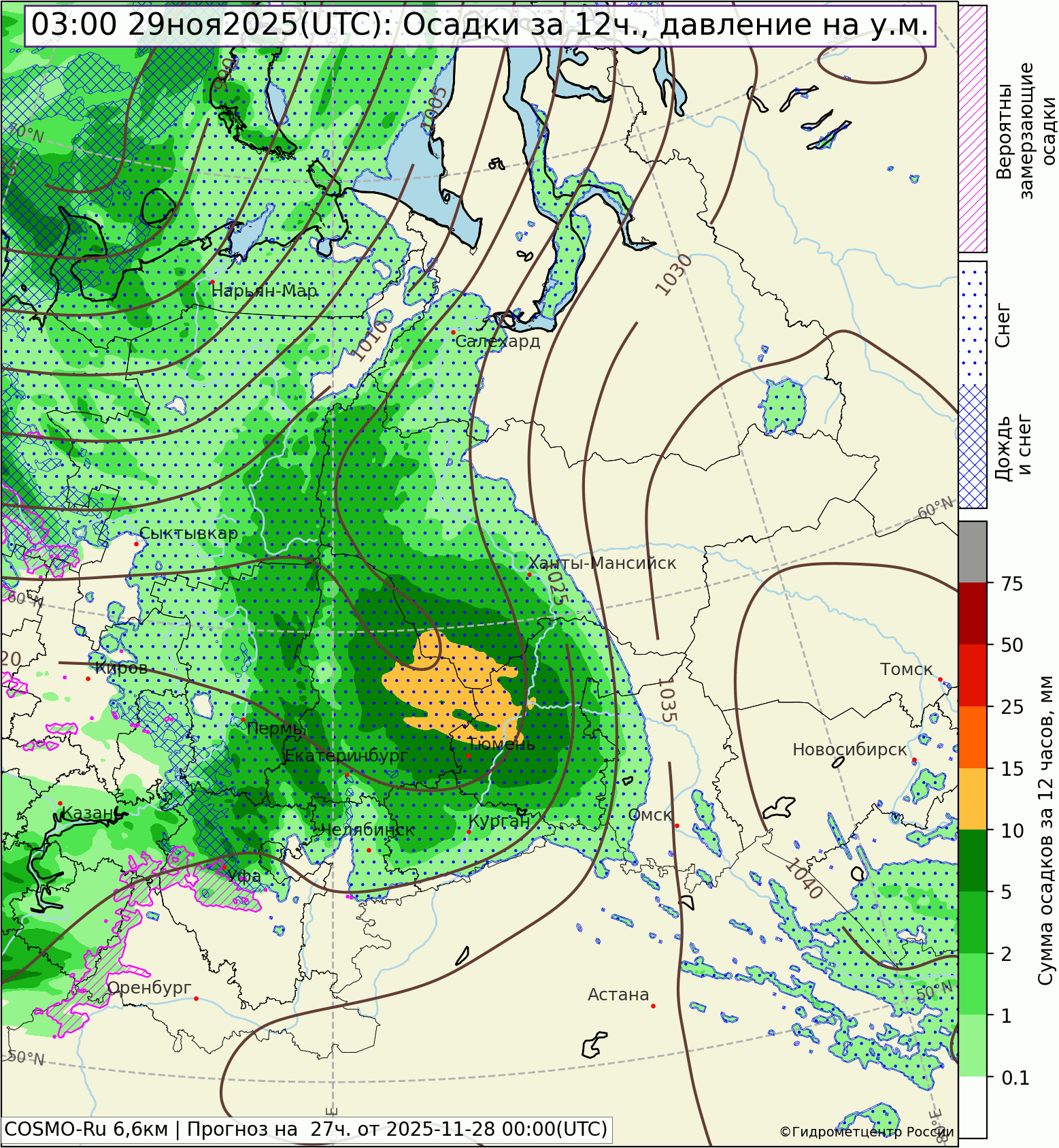 Циклон, несущий тепло, идет по северному пути (вблизи Арктического побережья) и уже завтра «сметет» морозы -30,-40°, охватившие северные территории Уральского ФО. Теплый участок атмосферного фронта с небольшими снегопадами на подходе к Свердловской области, к вечеру 28 ноября на юге области до +1,+2°. Ночью 29 ноября подоспеет холодный участок фронта, добавит снега, больше осадков будет на севере области. На Южном Урале, вдали от центра циклона, осадков выпадет мало.