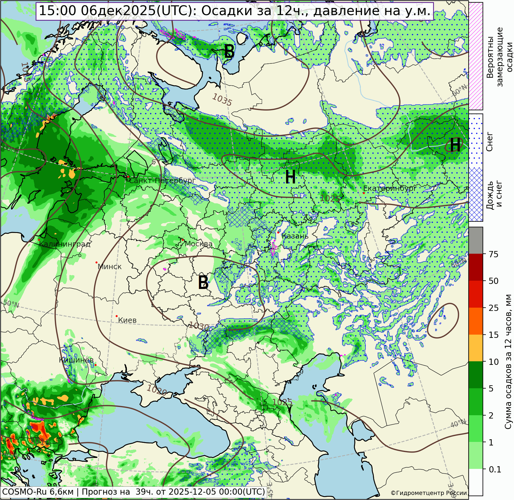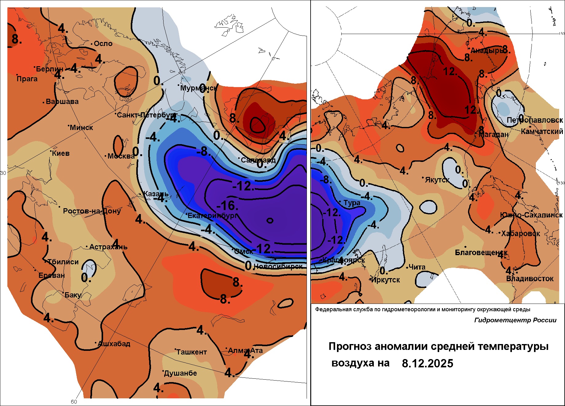 Прогноз осадков на день 6 декабря и аномалии температуры воздуха на холодный день 8 декабря