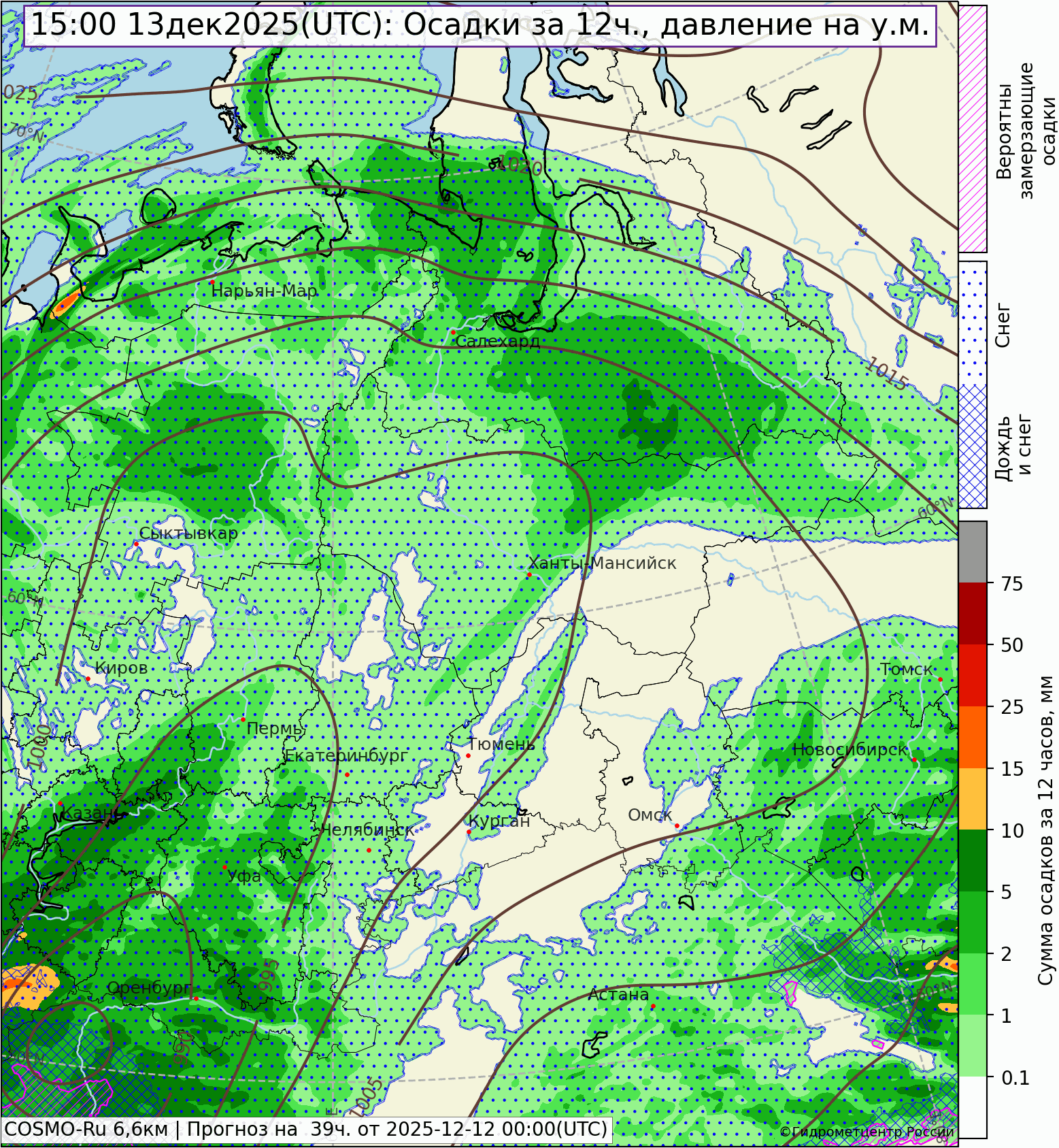Прогноз осадков и температуры днем 13 декабря