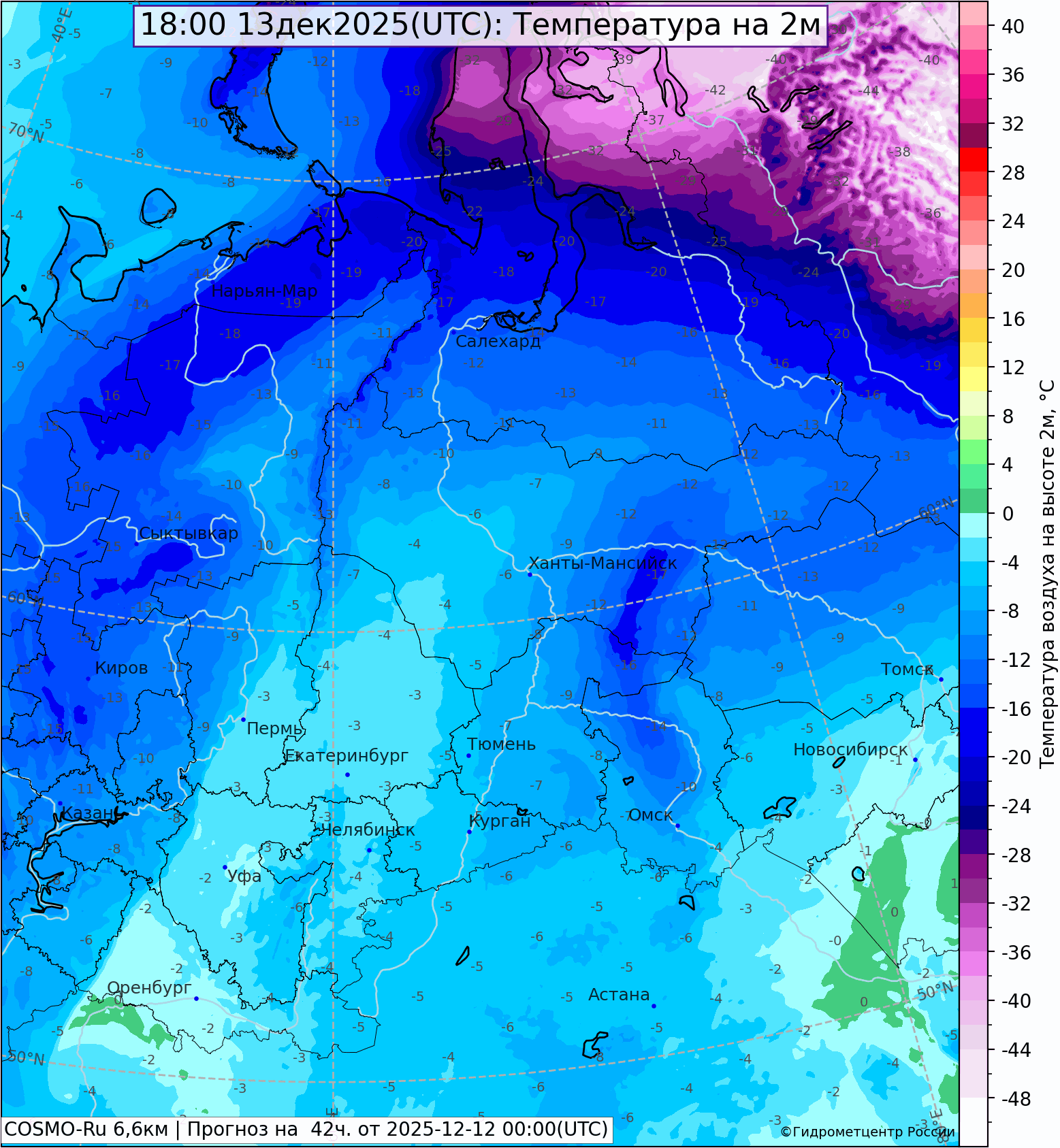 Ложбина циклона над Коми вытянулась в центр ЕТ России, куда уже начал поступать арктический воздух. Ночью 13 декабря холодный воздух проникнет в Поволжье, где к утру образуется новый глубокий циклон. Объединившись с собратом над Коми, он направится на Башкирию, затем поднимется на север, приближаясь к границам Свердловской области 14 декабря. 14-15 декабря ожидаются сильные снегопады при ухудшении видимости, метели, снежные заносы на дорогах. Усилится мороз, следующая неделя будет холоднее нормы на 4-6°.