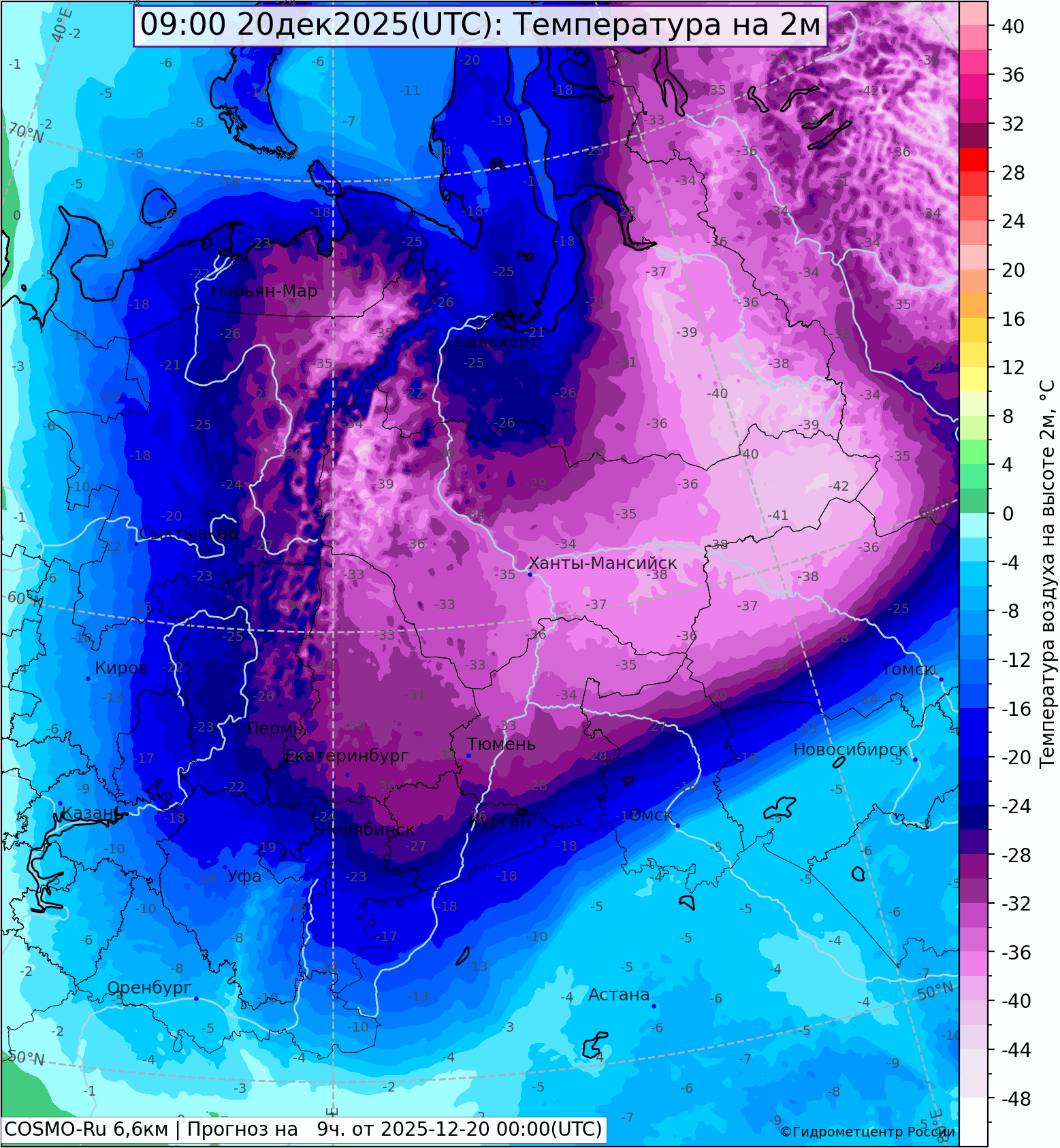 Ночью осадки были небольшими (0,1-2 мм). Похолодало повсеместно до -25,-32°, на севере до -33,-36,4° (Ивдель).