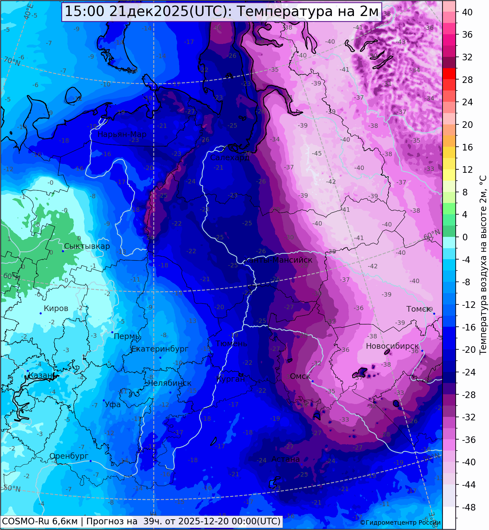 20 декабря пришедший с Арктики антициклон удержит морозную погоду (-25,-30°), без существенных осадков. Ночью 21 декабря крепкий мороз сохранится, к утру из-за появления юго-западного ветра, вероятных осадков может ослабеть в западных районах области на 5°.