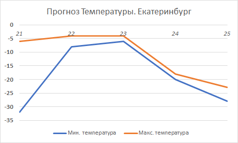 Екатеринбург: днем -6,4 (4 мм осадков), ночью -26° (2 мм осадков)
