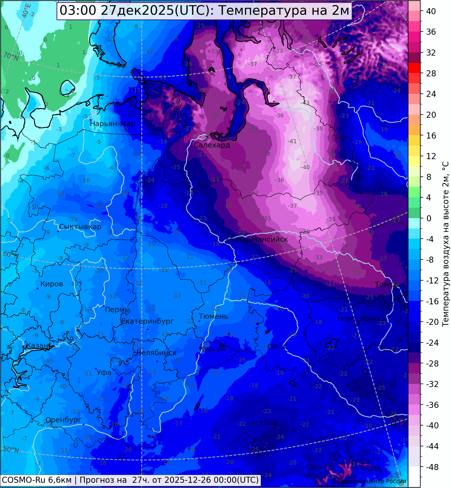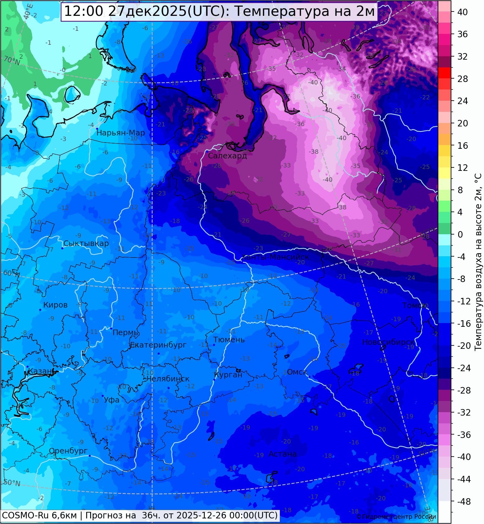 В течение дня 26 декабря температура повысится до -13,-18°. Завтра ожидается смена направления воздушных потоков с северо-западных на западные, затем на юго-западные. Циклон, опустившийся со Скандинавии на ЕТ России, окажет влияние на погоду Свердловской области уже 28 декабря, но в большей степени 29 декабря (умеренный снег). Температура будет на 1-2° выше нормы, в среднем за сутки составит -12,-14°. После прохождения циклона осадки ослабеют, температура понизится на 3-5°.
