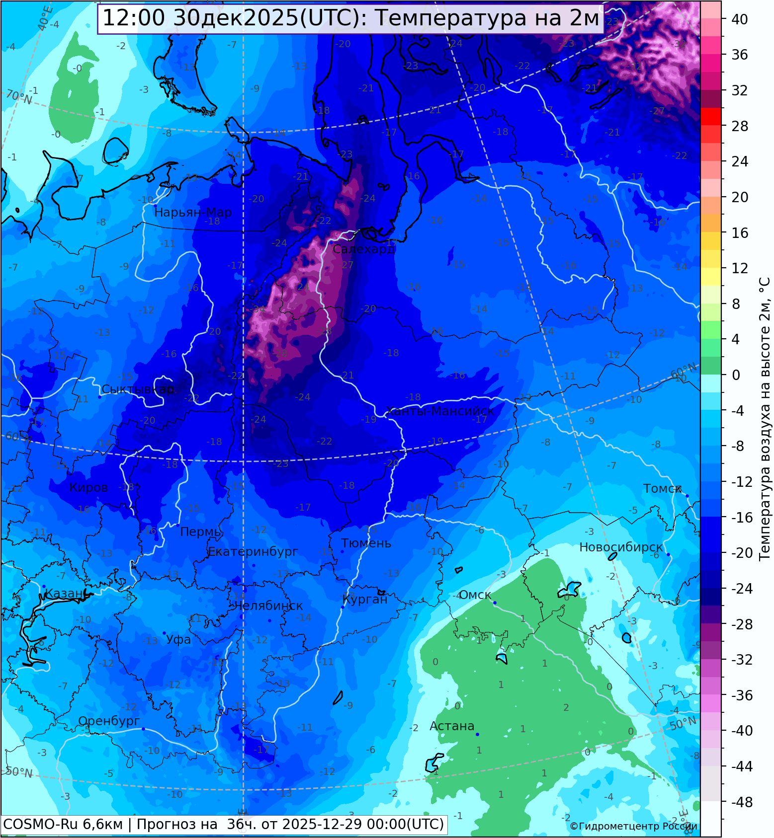 Днем 29 декабря с уходом циклона на восток осадки почти прекратятся. В ночь на 30 декабря под влиянием промежуточного барического гребня станет меньше облаков, ослабеет почти до штиля ветер, усилится выхолаживание приземного воздуха. Станет на 7-13° морознее. 31 декабря циклон с ЕТ России направится на восток, двигая свою фронтальную систему к Уралу – вероятен небольшой снег и повышение температуры до умеренных значений, на севере области при этом достаточно морозно: -20,-25°. 1 января встреча нового года пройдет при температуре, близкой к норме и небольшом снеге.