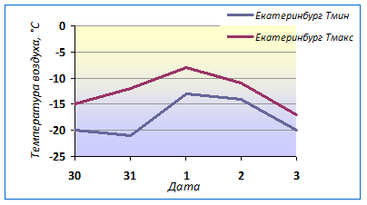 Атмосферный фронт принес порцию снега, за сутки выпало 1-8 мм осадков: больше всего в Бутке. Каменске-Уральском, Сысерти, Тугулыме – 7мм, Камышлове – 8 мм. Температура воздуха днем была от -5,4° (Красноуфимск) до -13,7° (Ивдель, Бурмантово), преобладающая температура -6,-11°. Минувшей ночью на юге области было -9,-14° (Краснотурьинск, Шамары -8,6°), на севере области -17,-23° (Ивдель -23,3°). Екатеринбург: днем -8,8° (осадков 0,9 мм), ночью -13,3° (осадков 3 мм).