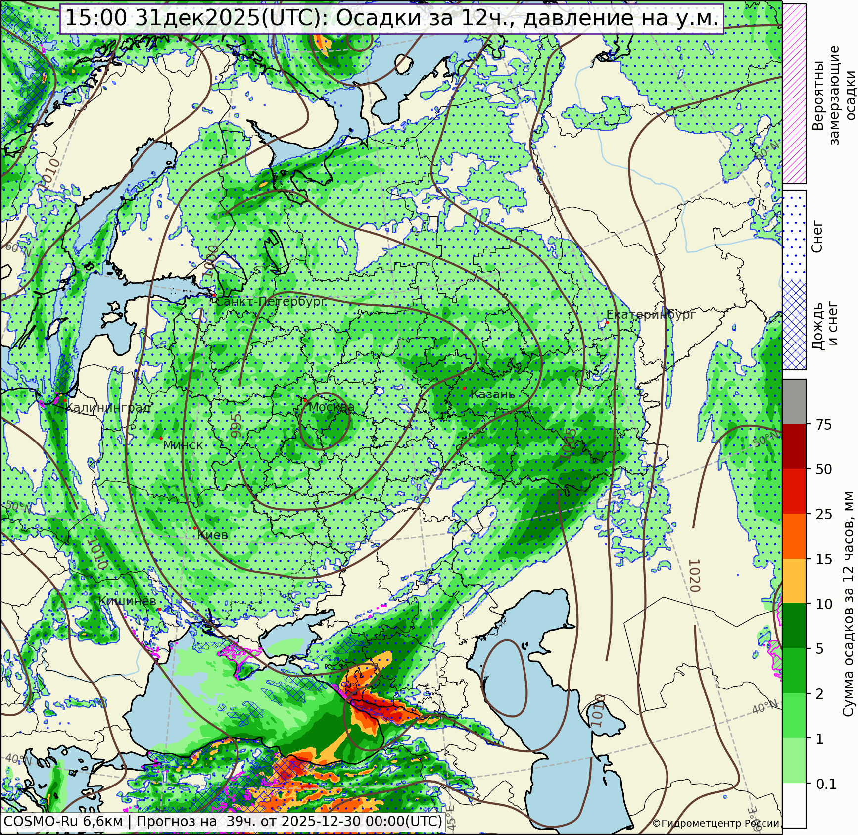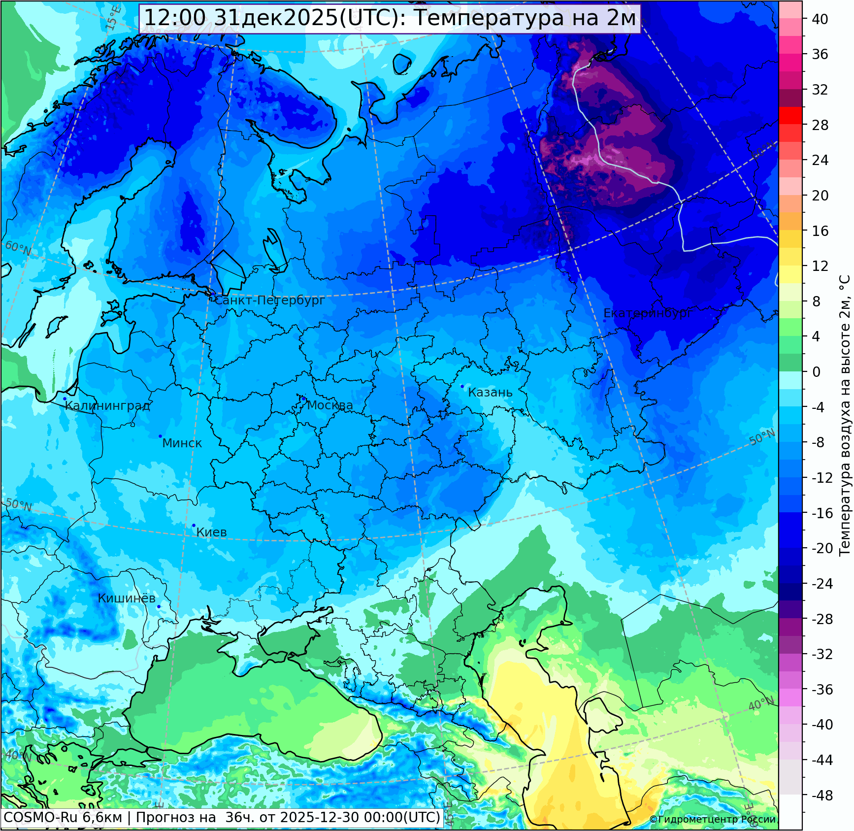 Днем 30 декабря под влиянием небольшого антициклона существенные осадки маловероятны, температура -13,-18, на крайнем севере до -23°. 31 декабря к вечеру с Поволжья надвинется атмосферный фронт обширного циклона, занимающего центр ЕТ России. Под его влиянием ожидаются осадки (количество до 1-4 мм), температура повысится на 5-7° (до нормы и на 2° превысит норму). 1 января при умеренно морозной погоде вероятен снег, 2-3 января существенных осадков в Свердловской области не ожидается.