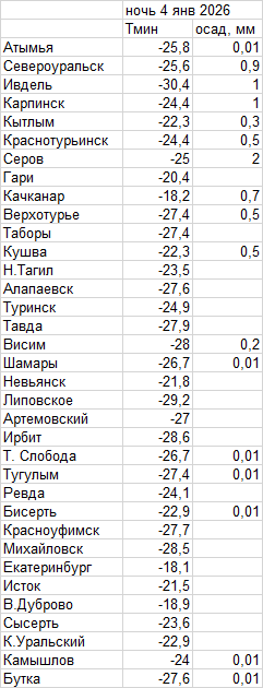 Днем существенных осадков не отмечено. Температура воздуха была от -9° (Тугулым) до -26,8° в Бурмантово, в Екатеринбурге -10,8°. Погода минувшей ночи в таблице.