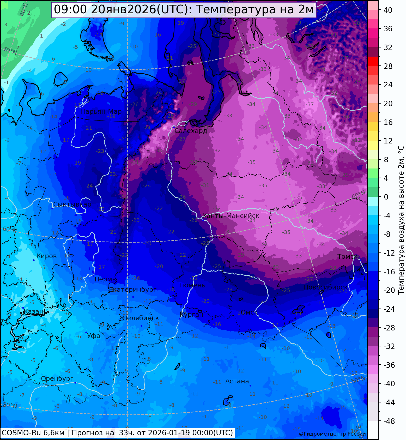 Сибирский холод уже завтра начнет продвигаться на запад, захватывая вначале крайний север области, 21 января, с ослаблением влияния циклона, большую её часть. Наиболее крепкий мороз -32,-37°, местами до -40,-43° ожидается 22-23 января.