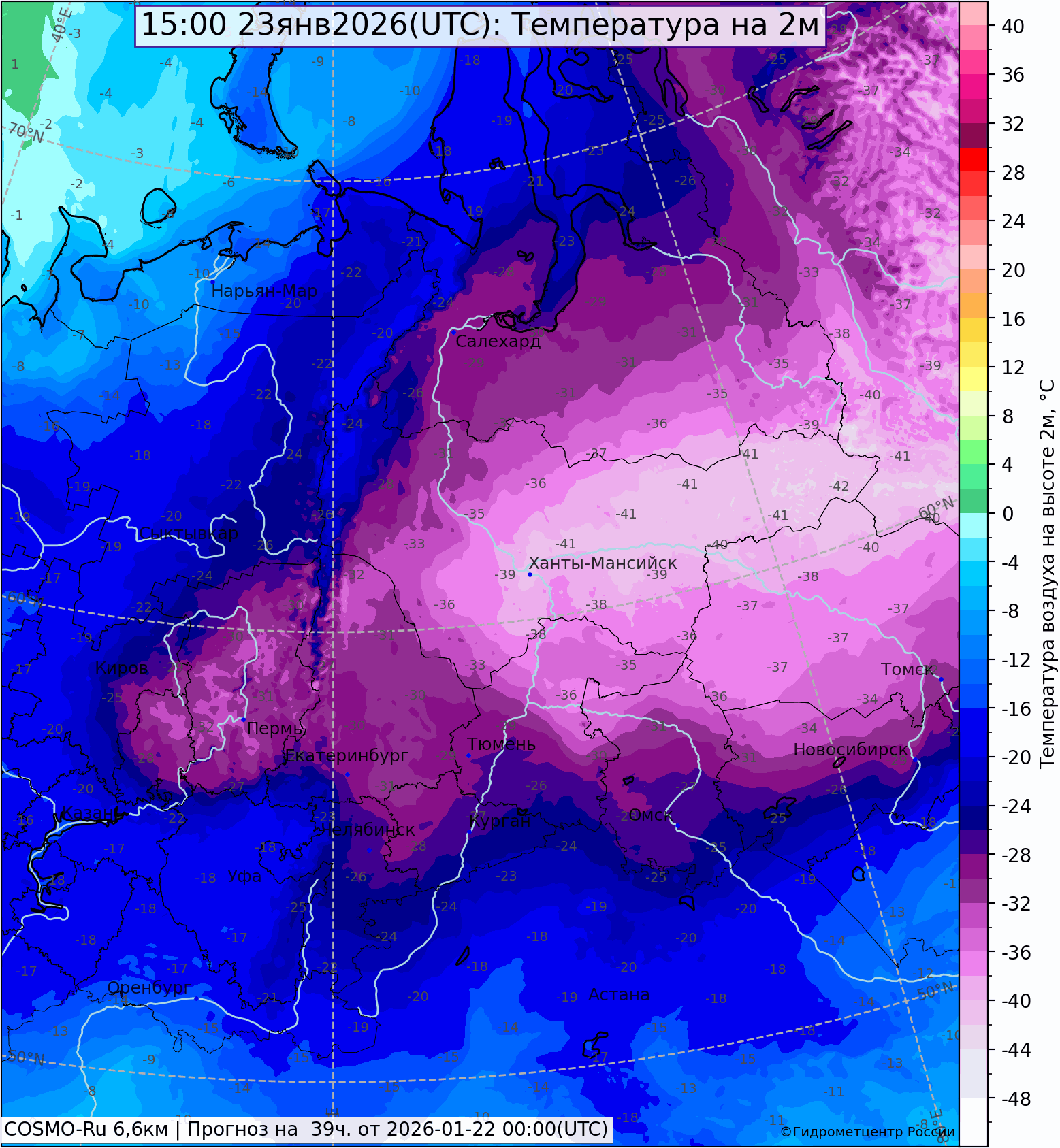 Екатеринбург: днем -21,8 (0,4 мм осадков), ночь -30,5° (0,3 мм осадков).