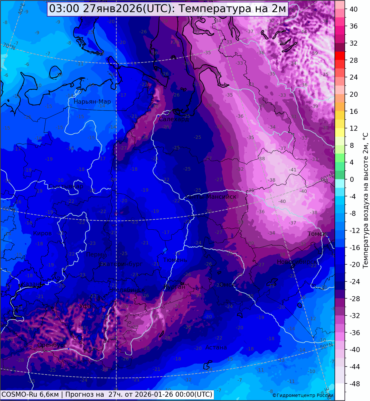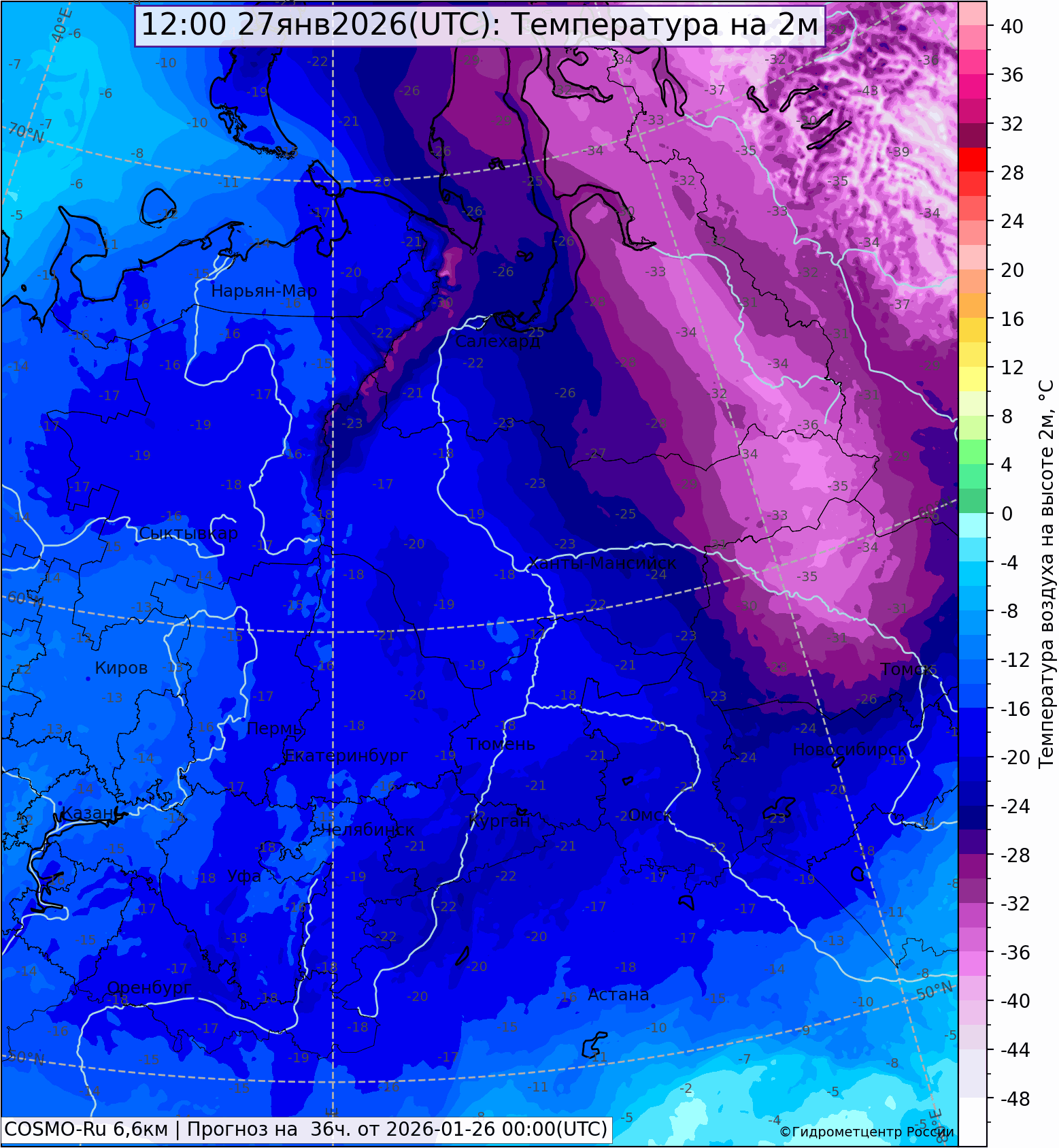 Под влиянием малоактивного циклона, действующего в северных районах ЕТ России, в Свердловской области вероятен небольшой снег и постепенное повышение температуры (в основном вследствие разрушения приземных инверсий). Температура -30° ближайшей ночью уже маловероятна. В период 28-30 января воздушные потоки доставят на Урал теплый воздух с Черноморского бассейна. Атмосферный фронт, поднимаясь по западной периферии антициклона уходящего с ЕТ России на северо-запад Казахстана, вызовет снегопады в Свердловской области и Пермском крае.