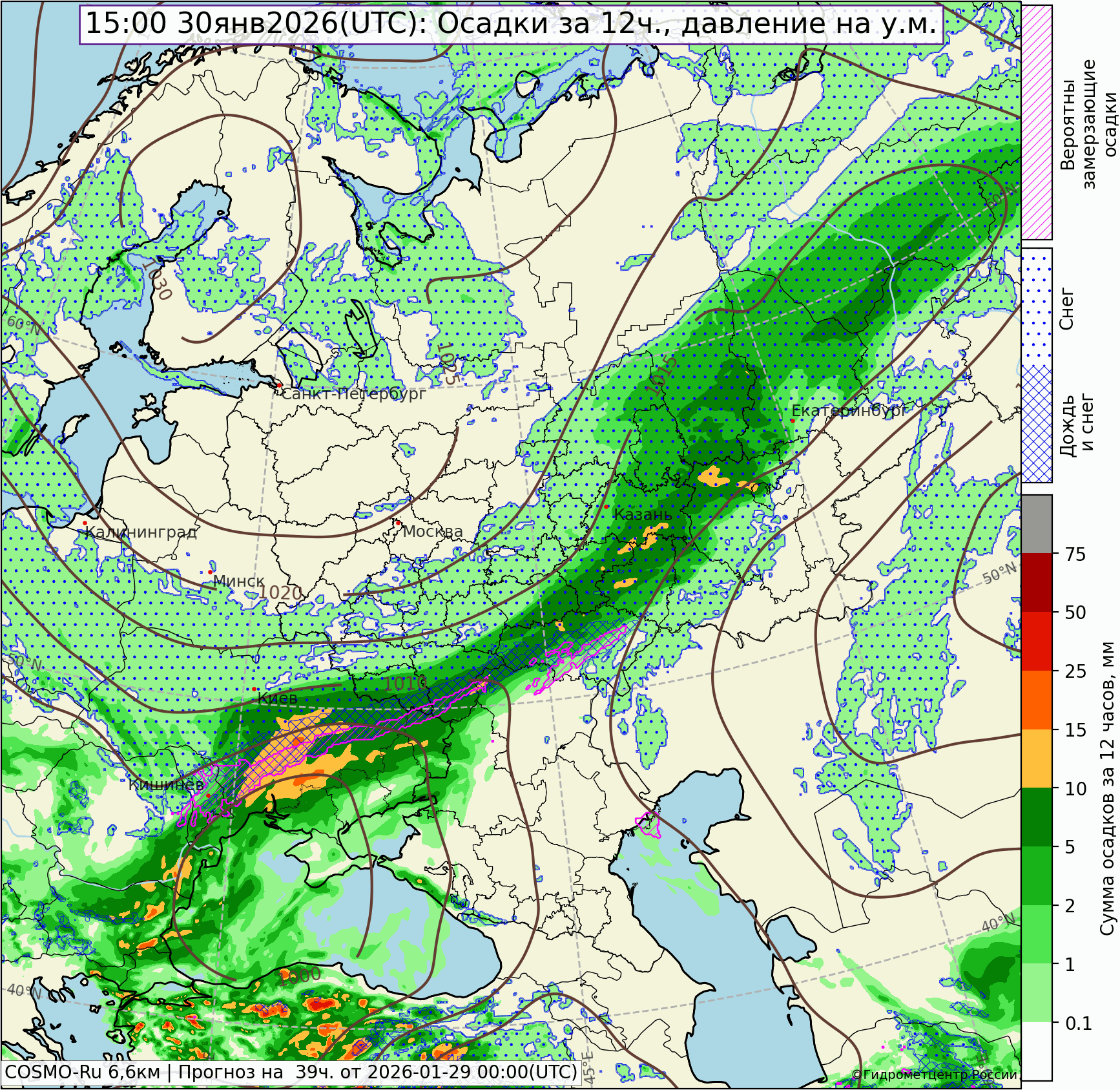 В зоне атмосферного фронта больше всего осадков за сутки выпало в Шамарах, Бисерти 8 мм, Красноуфимске 7, Висиме 5, Ревде 4 мм, в остальных районах 0,6-3 мм на крайнем севере существенных осадков не было. Днем температура была -10,-13°, ночью от -11° на крайнем юге (Камышлов) до -32,8° на крайнем севере (Атымья). Екатеринбург: днем -11,7 (осадков 0,2 мм), ночью -12,3° (3 мм осадков).