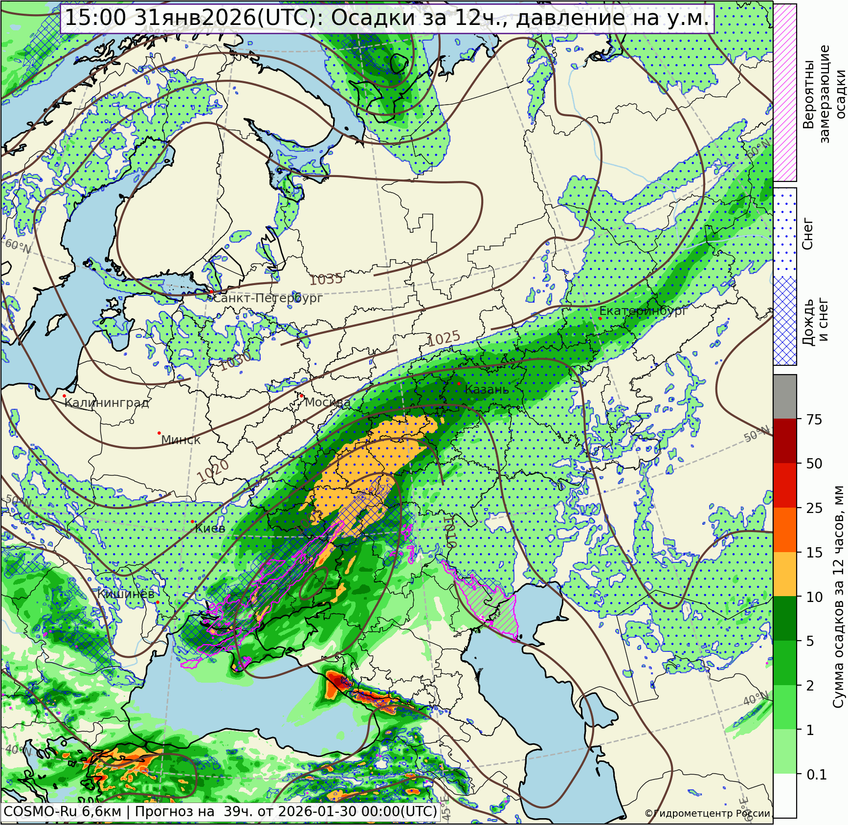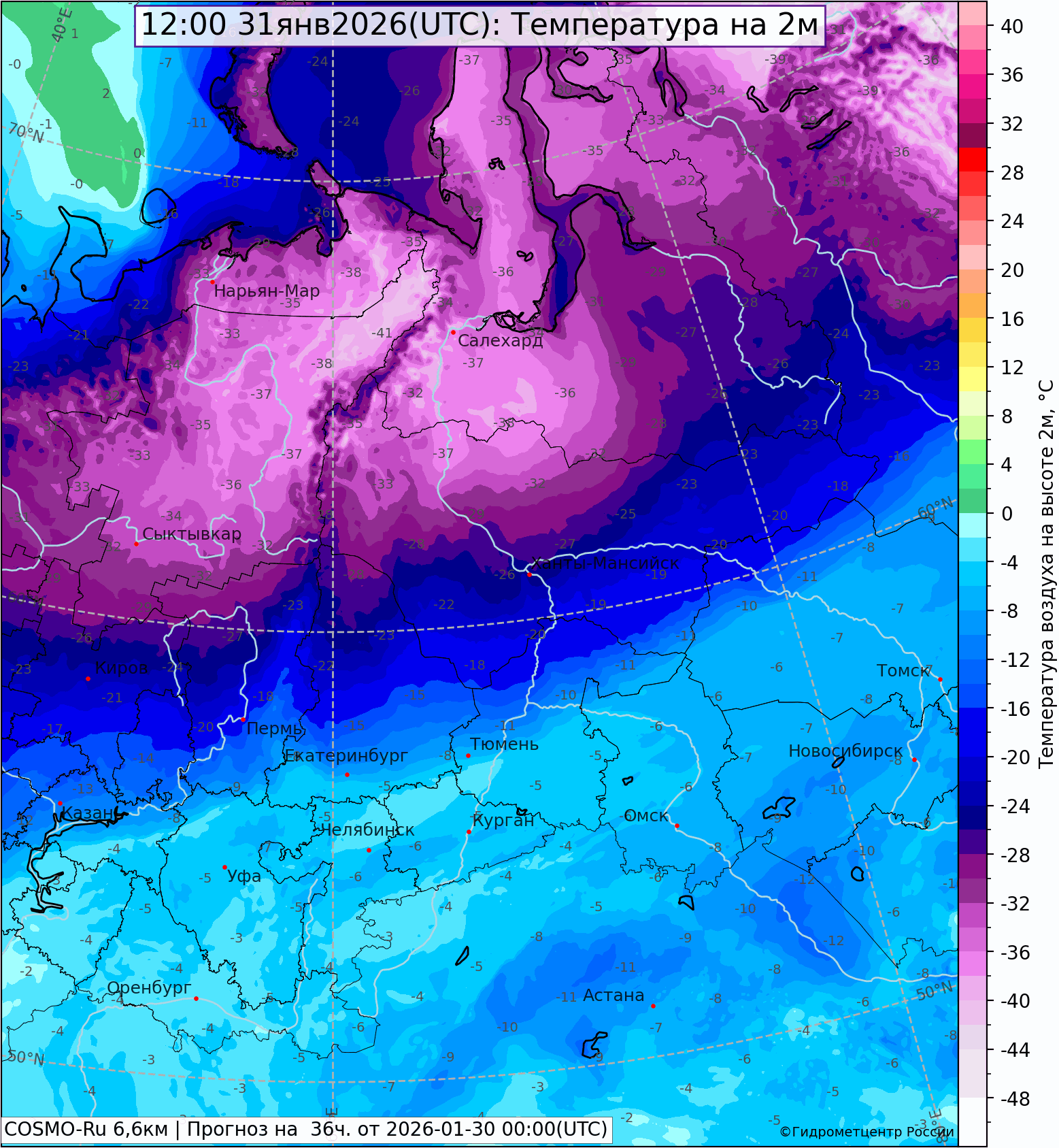 В ближайшие сутки очередная фронтальная волна, пройдет через южные районы области, снегопад в южных районах, в том числе в Екатеринбурге, возобновится. На севере области, напротив, осадки прекратятся и будет холодать. Холодный воздух скопившийся на севере ЕТ России и Урала, будет опускаться, оттесняя тепло на юг. На севере мороз окрепнет уже ближайшей ночью до -25,-30°, в центре Свердловской области до -15,-20°, лишь на крайнем юге тепло задержится на сутки, но 1 февраля температура и здесь понизится до умеренного мороза.