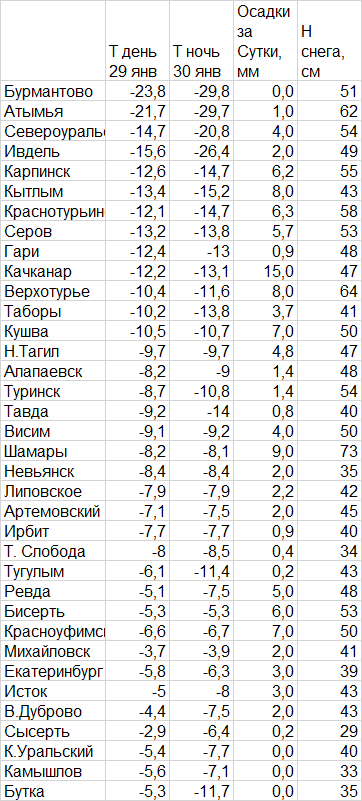 Погода в Свердловской области с 08 ч. 29 января до 08 ч. 30 января 2026 г.