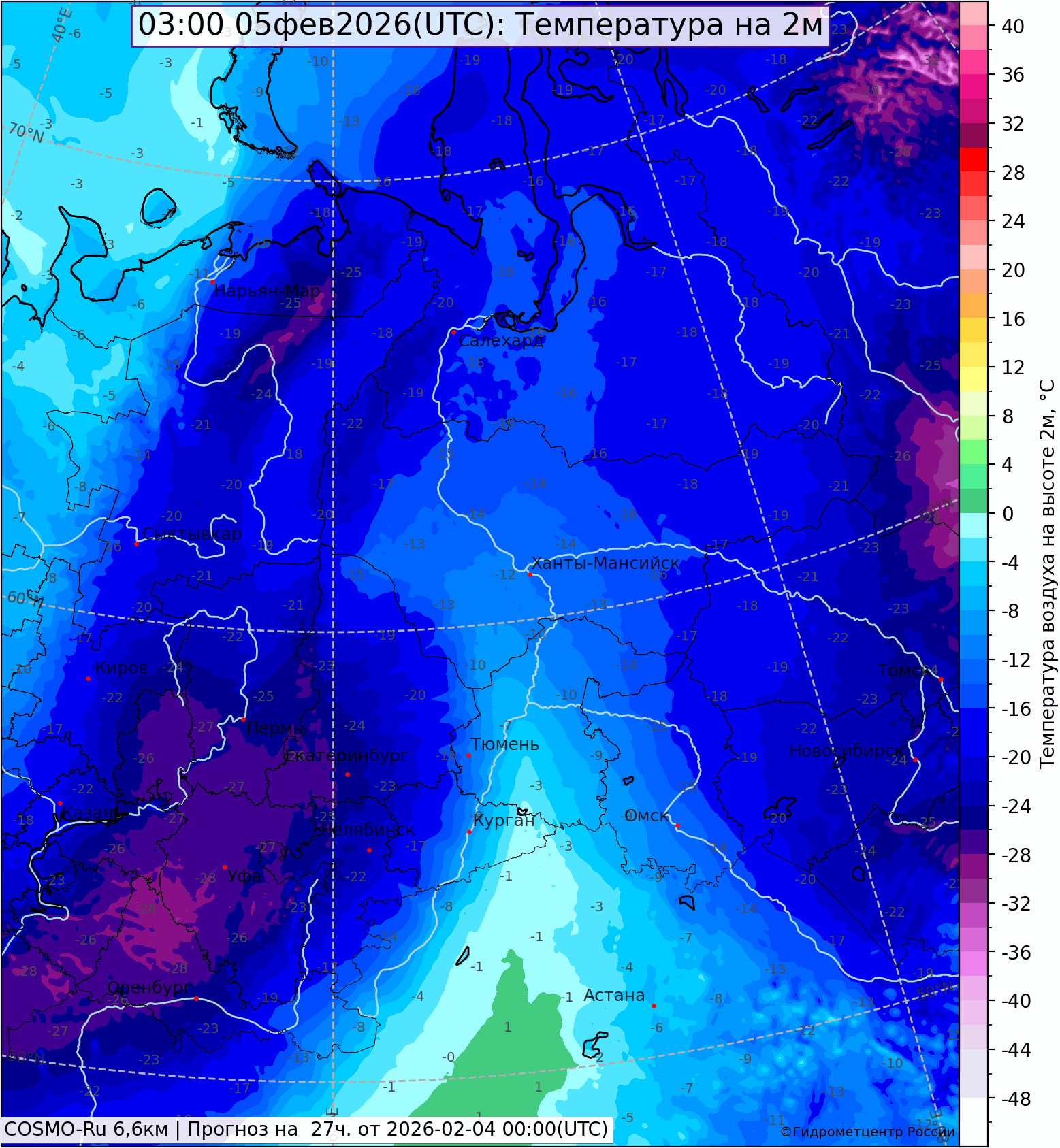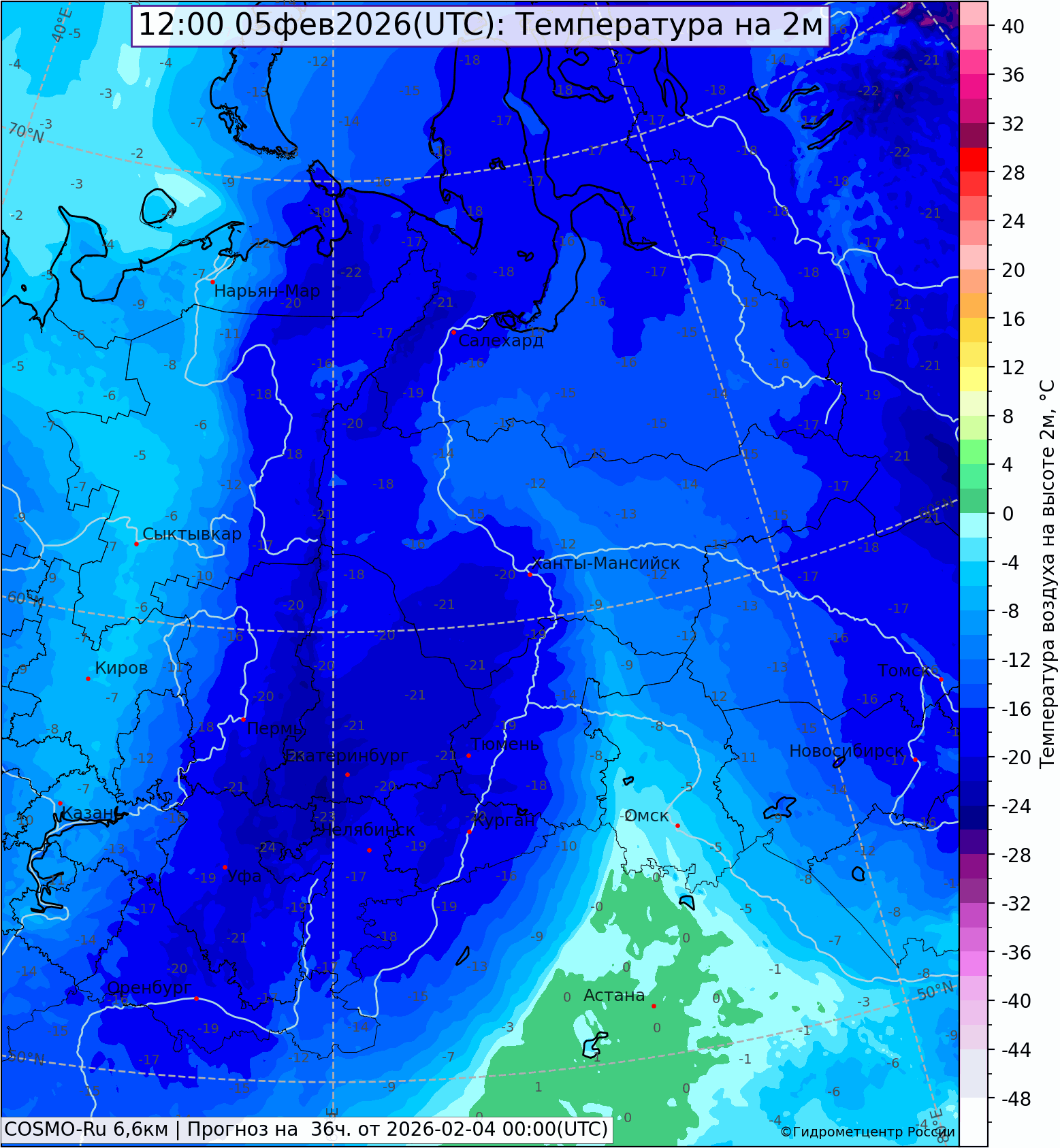 Циклон в течение ближайших суток поднимется на Коми и вольется в глубокую арктическую депрессию. Атмосферный фронт, двигаясь на восток по территории Свердловской области и оставляя снежный след, ночью 5 февраля выйдет за пределы области. Холодный воздух с ЕТ России поступит на Урал, температура ночью 5 февраля понизится до -22,-25°, на крайнем юго-западе области до -30°.