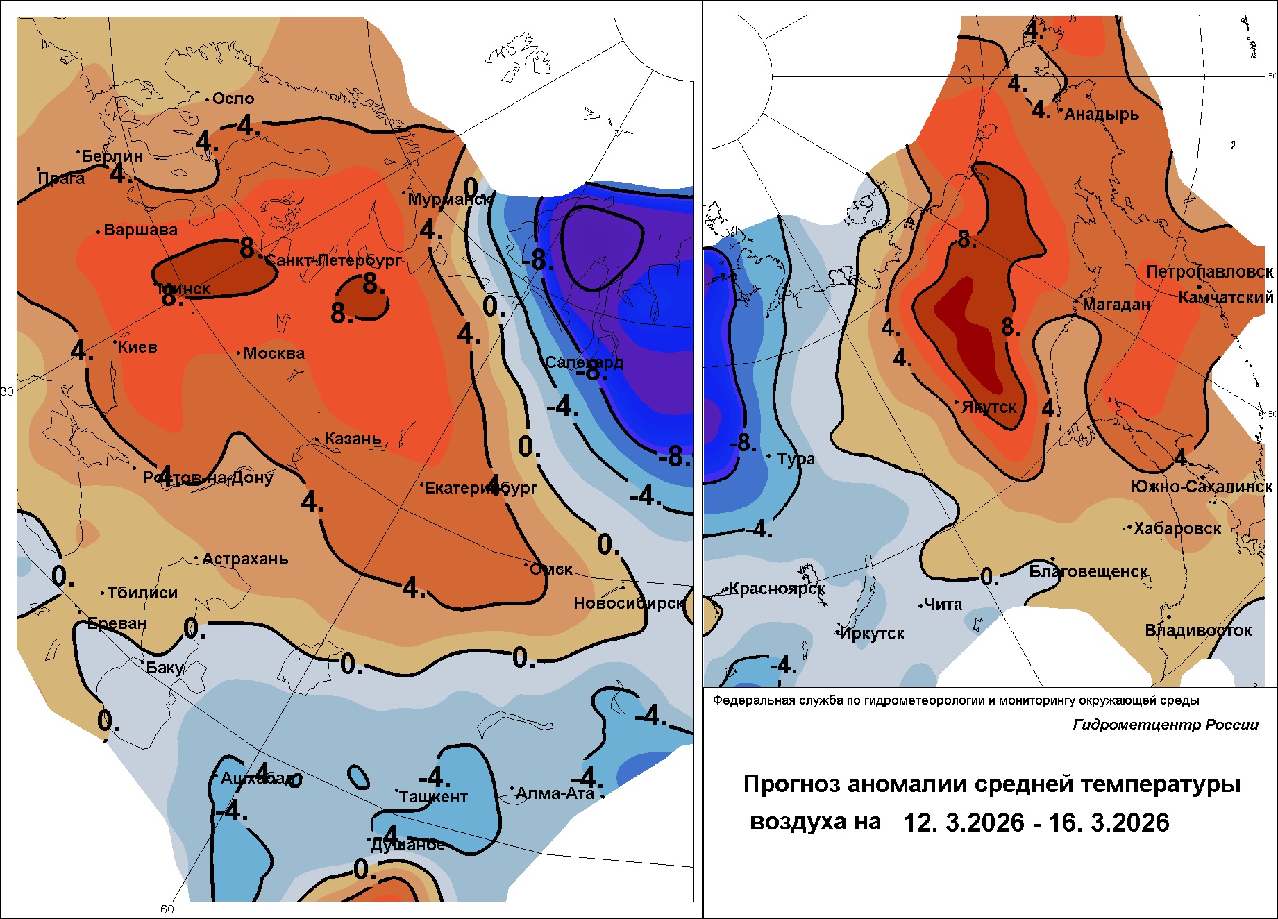 Наступление теплого воздуха продолжится, западные ветры будут продвигать весну на восток и на север, тесня холод на север Красноярского края, на Таймыр. В ближайшие 4-5 дней в Свердловской области ожидаются устойчивые оттепели, в конце недели даже в ночные часы температуры могут едва опускаться ниже 0°. Атмосферные фронты сдвинутся на Северный Урал, унося осадки. В Свердловской области их будет немного, осадки вероятны сегодня днем и ночью 12 марта на севере и востоке области (снег, мокрый снег, гололедные явления).