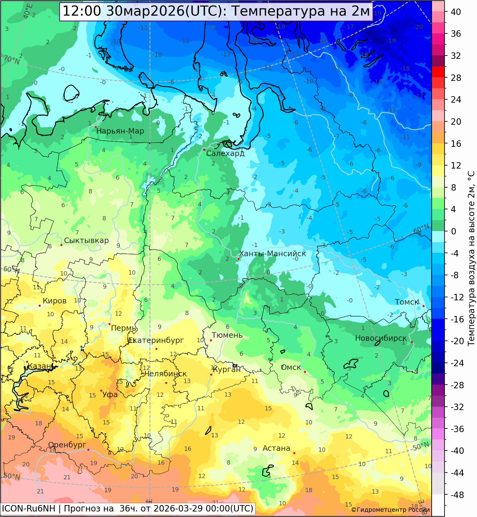 Атмосферный фронт над Свердловской областью отделяет новый, более прохладный, антициклон над Коми от старого теплого ядра. Фронт лежит в барической седловине, выражен слабо и значимых осадков не принесет. Днем 29 марта и ночью 30 марта будет немного холоднее на севере Свердловской области, но в целом первая половина недели на всей территории будет теплой и преимущественно сухой. Ближе к концу рабочей недели циклоническая система с ЕТ России более решительно потеснит антициклон и вызовет на Урале осадки (дождь, ночью с мокрым снегом).