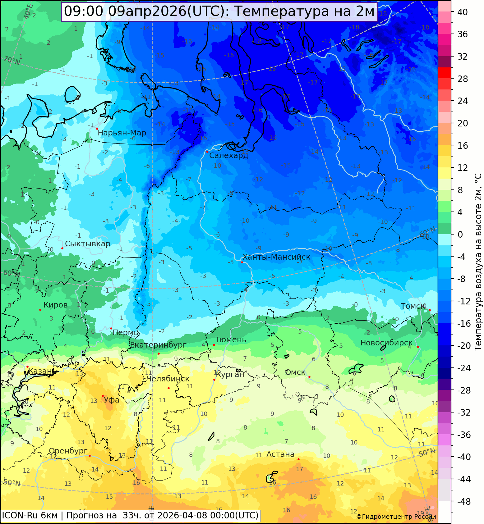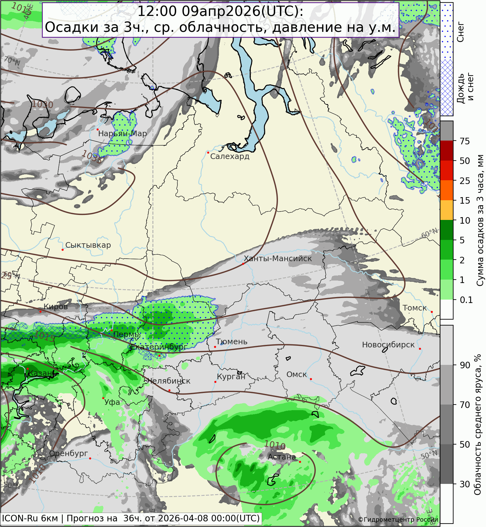 Ночью 8 апреля осадки ослабели, выпадали местами (0,1-2 мм) при температуре 0,-4°, в Тавде, Екатеринбурге +2,7°.